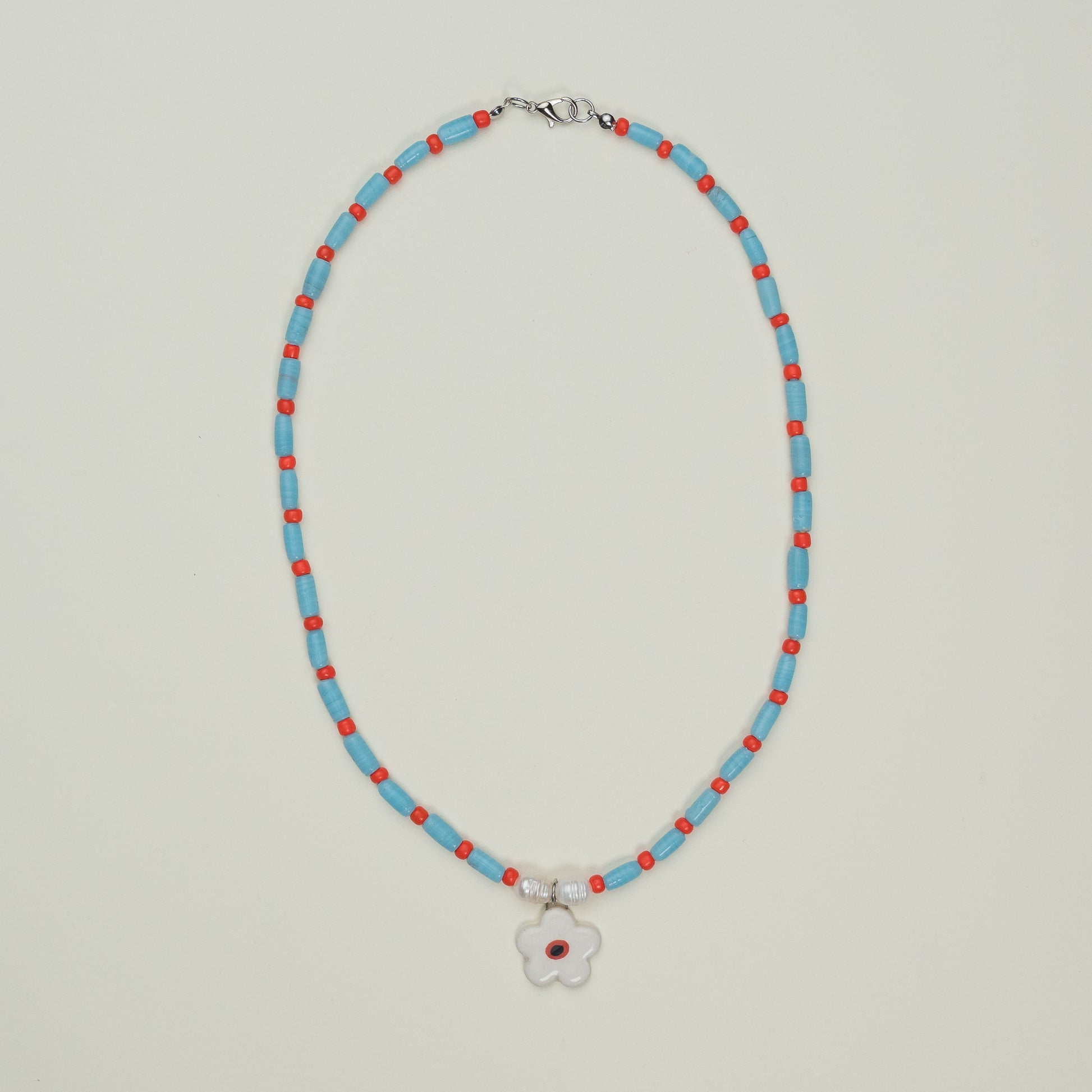 Collana con perline in pietra dura, perline in vetro, perle di fiume e ciondolo fiore bianco in ceramica fatto a mano. Chiusura in acciaio inossidabile.