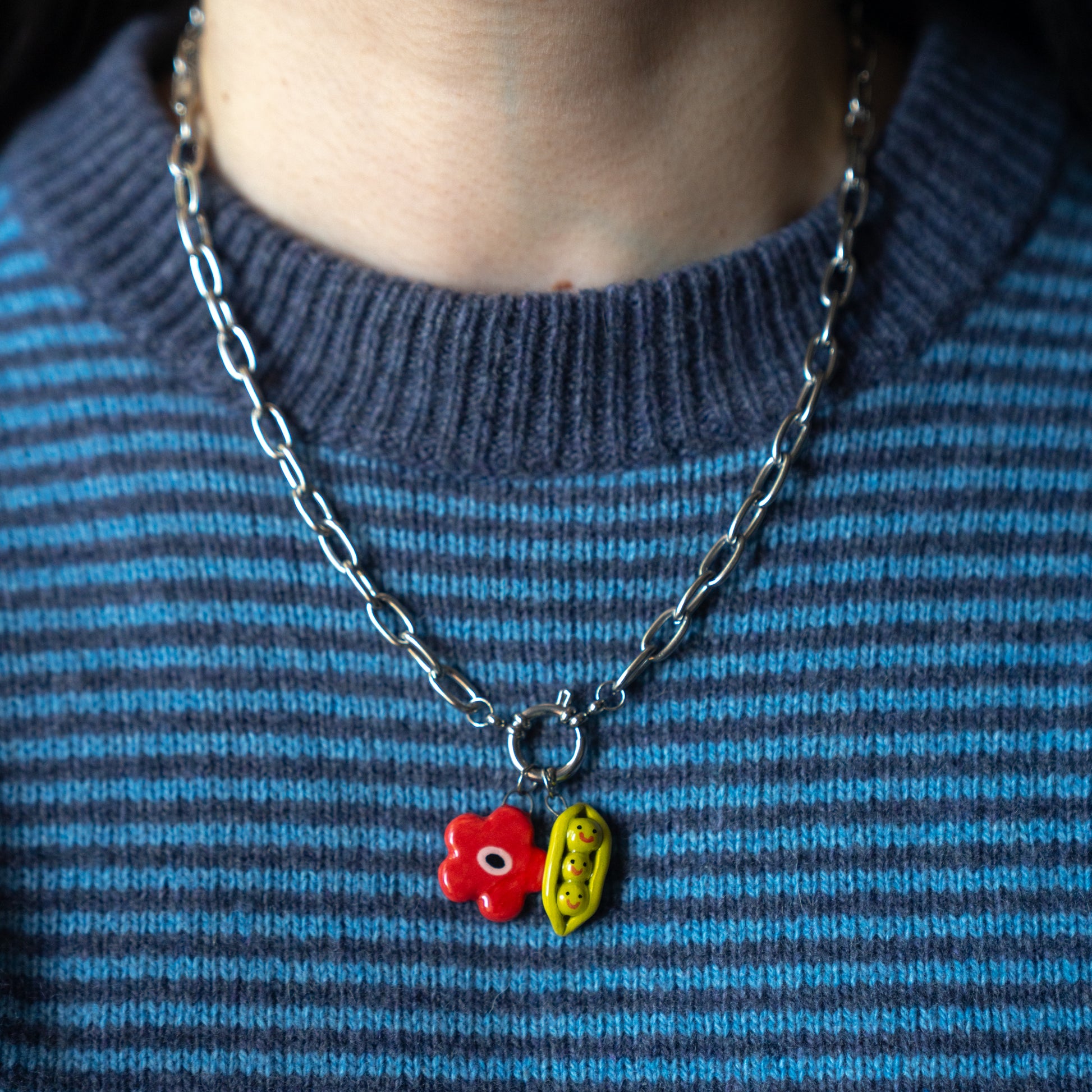 Catenella in acciaio inossidabile con ciondoli in ceramica fatti a mano (ciondolo pisellini e ciondolo fiore rosso). I ciondoli sono rimovibili.