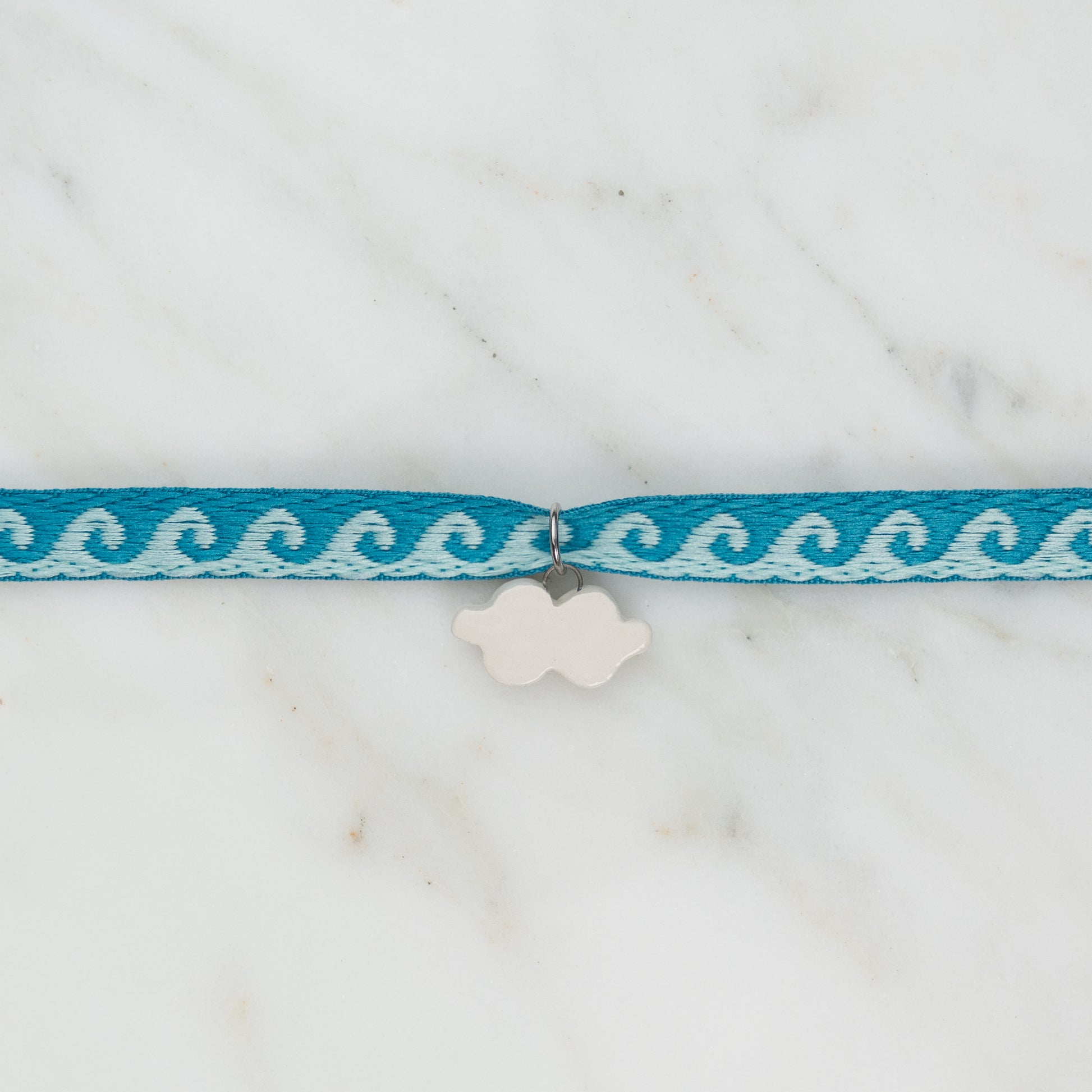 Choker con nastro ricamato e ciondolo nuvoletta in ceramica fatto a mano. Chiusura in acciaio inossidabile.