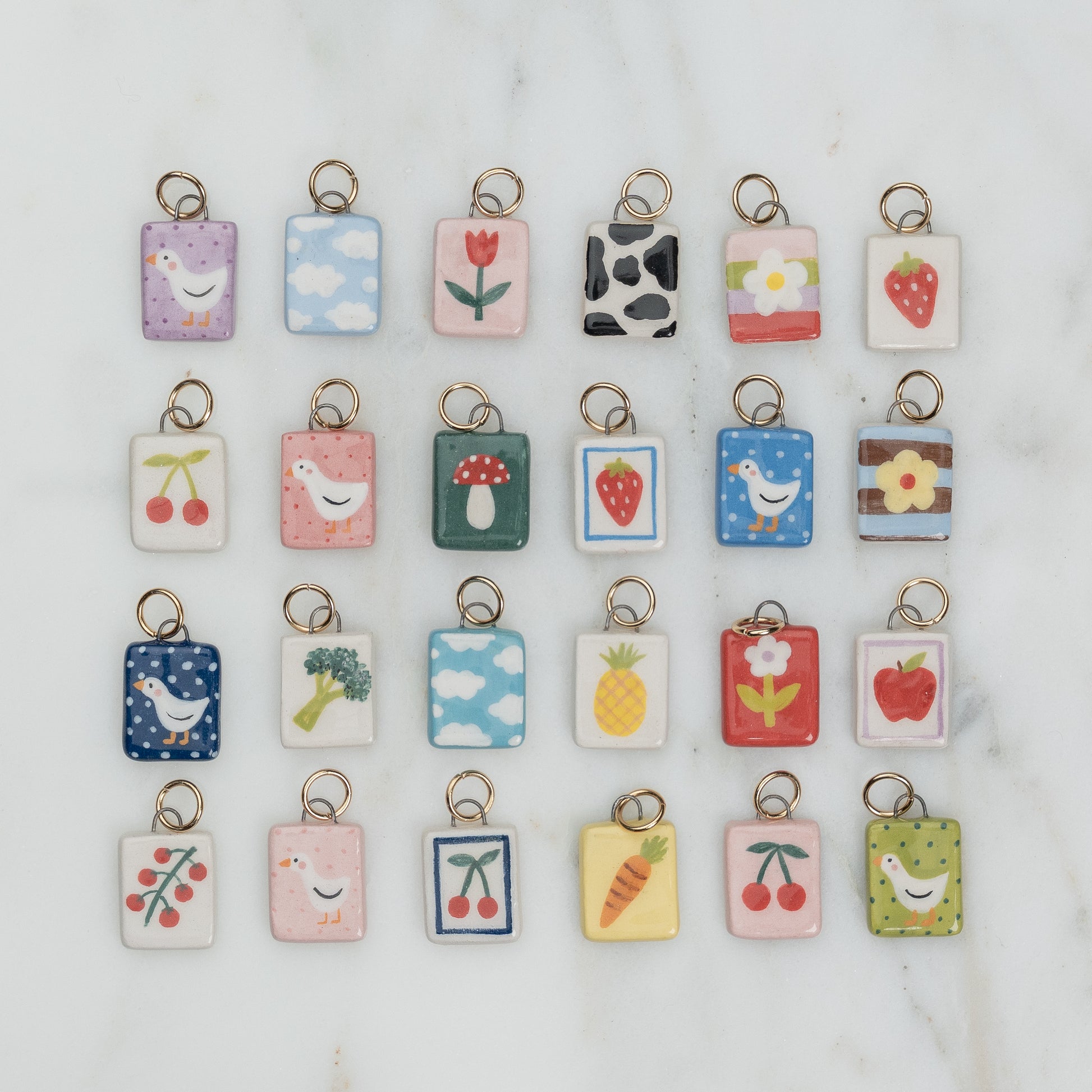 Ciondolini in ceramica interamente realizzati a mano. Anella in acciaio inossidabile. Dimensione del ciondolo: circa 1,5 cm x 1,7 cm.