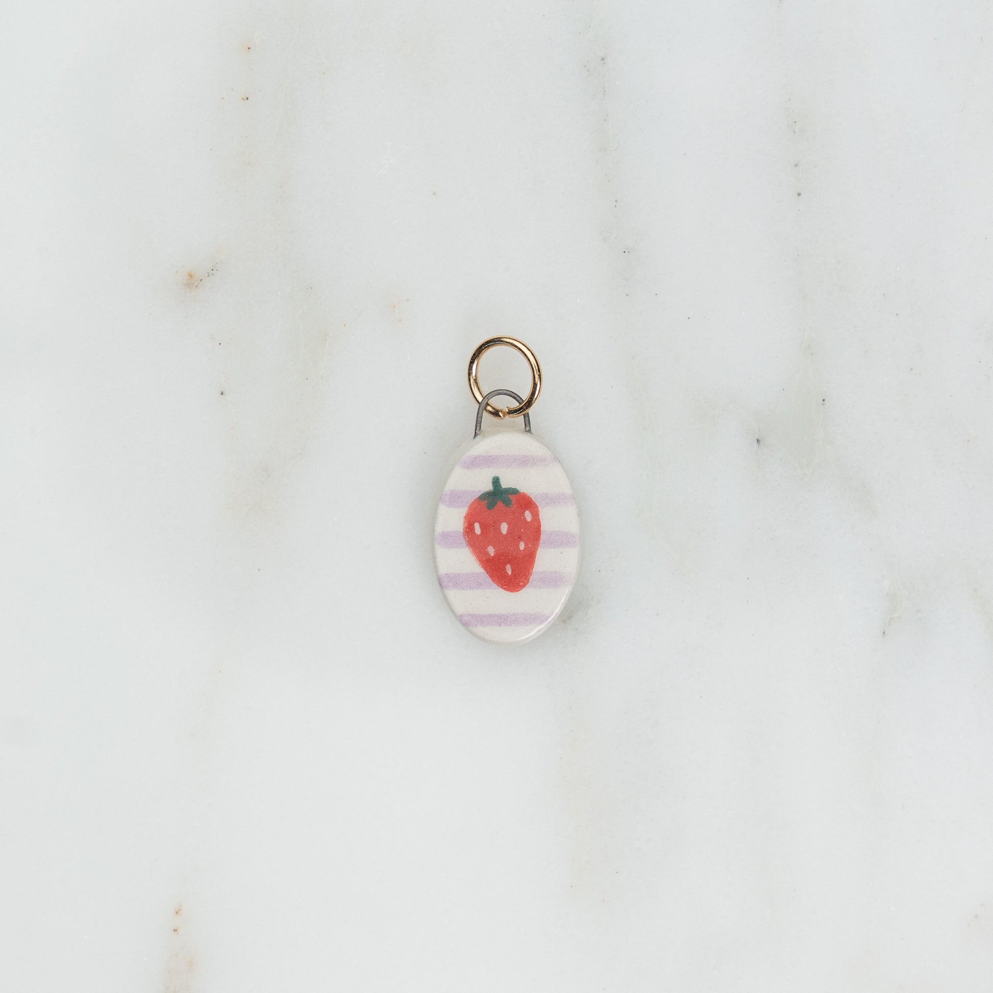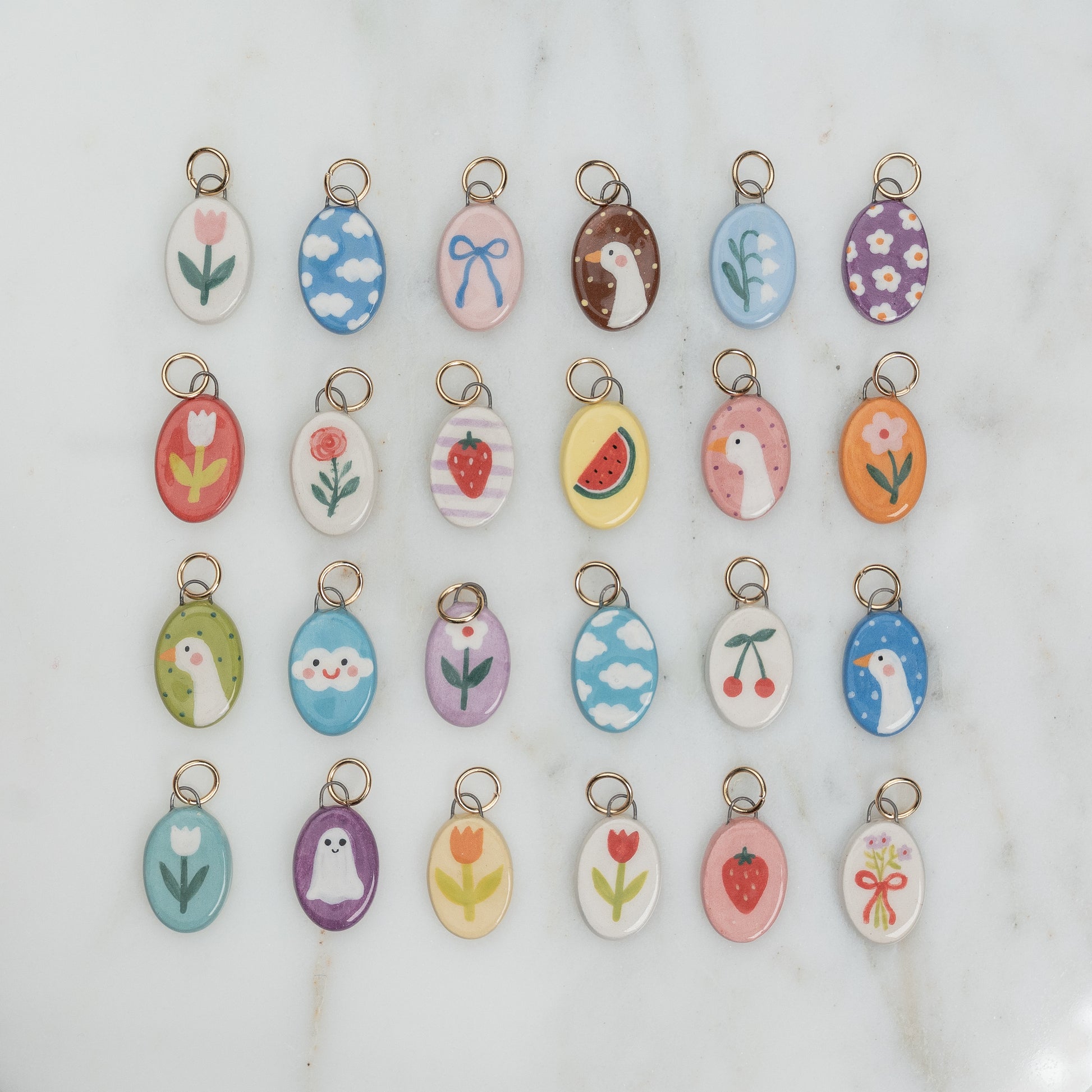 Ciondolini in ceramica interamente realizzati a mano. Anella in acciaio inossidabile. Dimensione ciondolo: 1,8 cm x 1,1 cm.