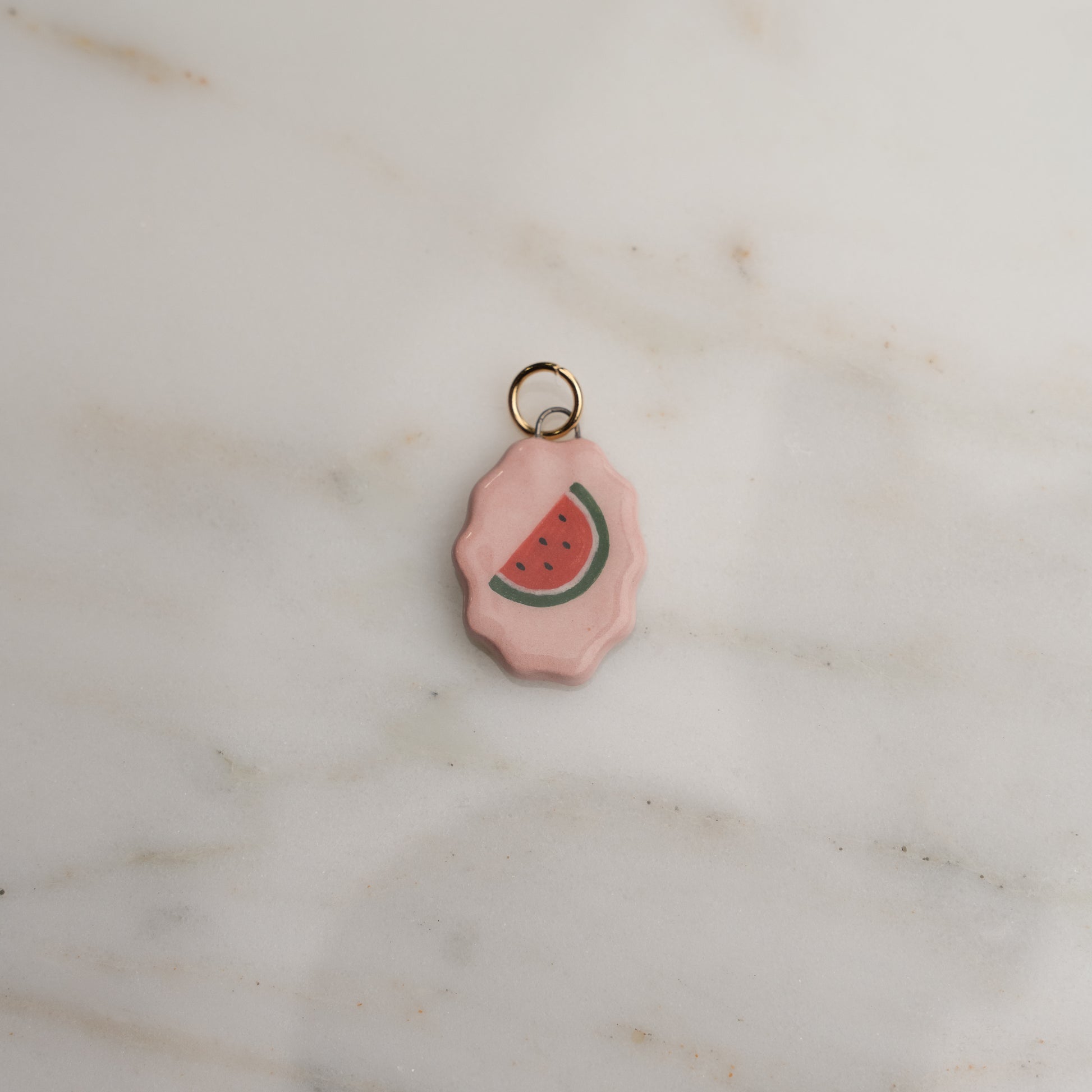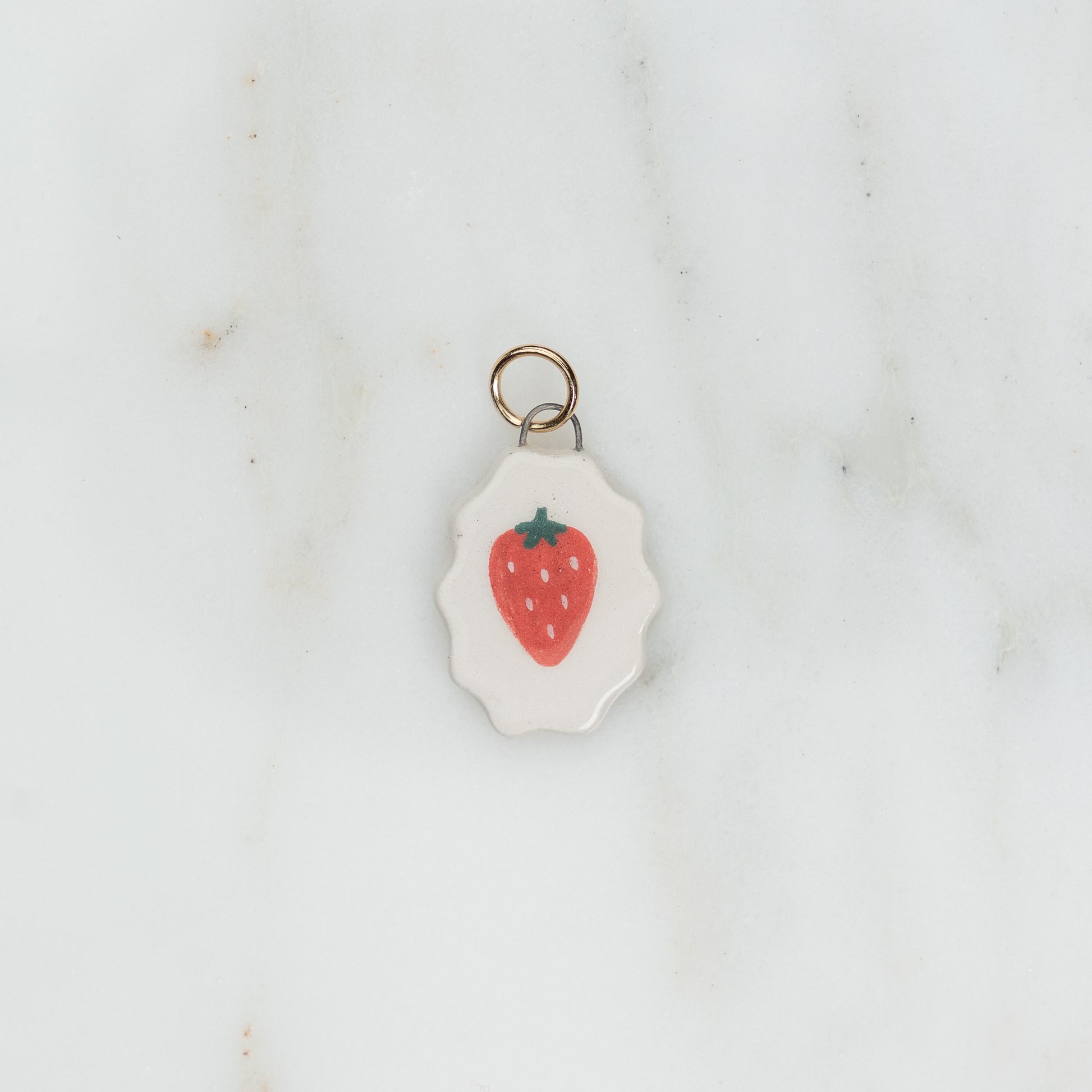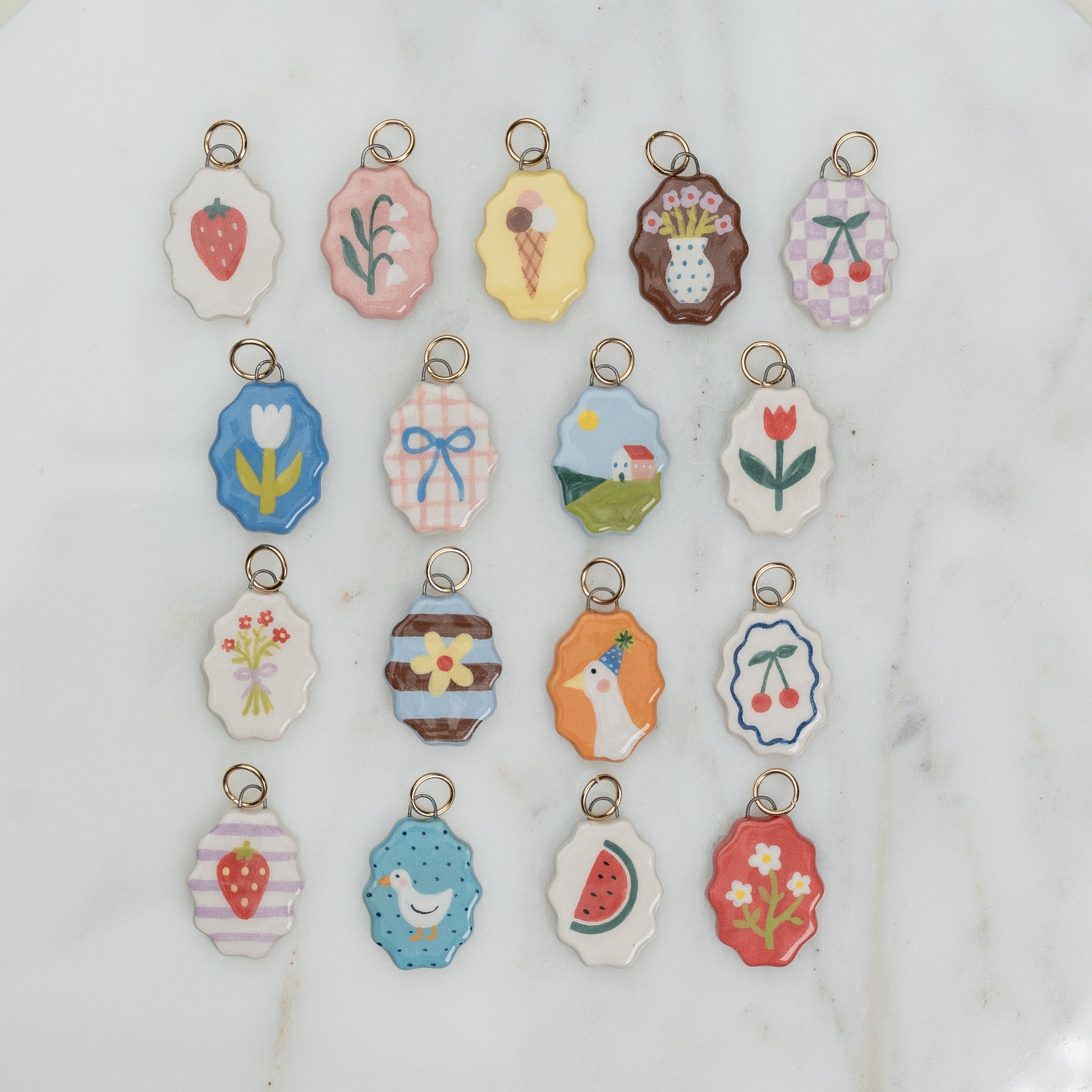 Ciondolini in ceramica interamente realizzati a mano. Anella in acciaio inossidabile. Dimensioni ciondolo: 2 cm x 1,5 cm.