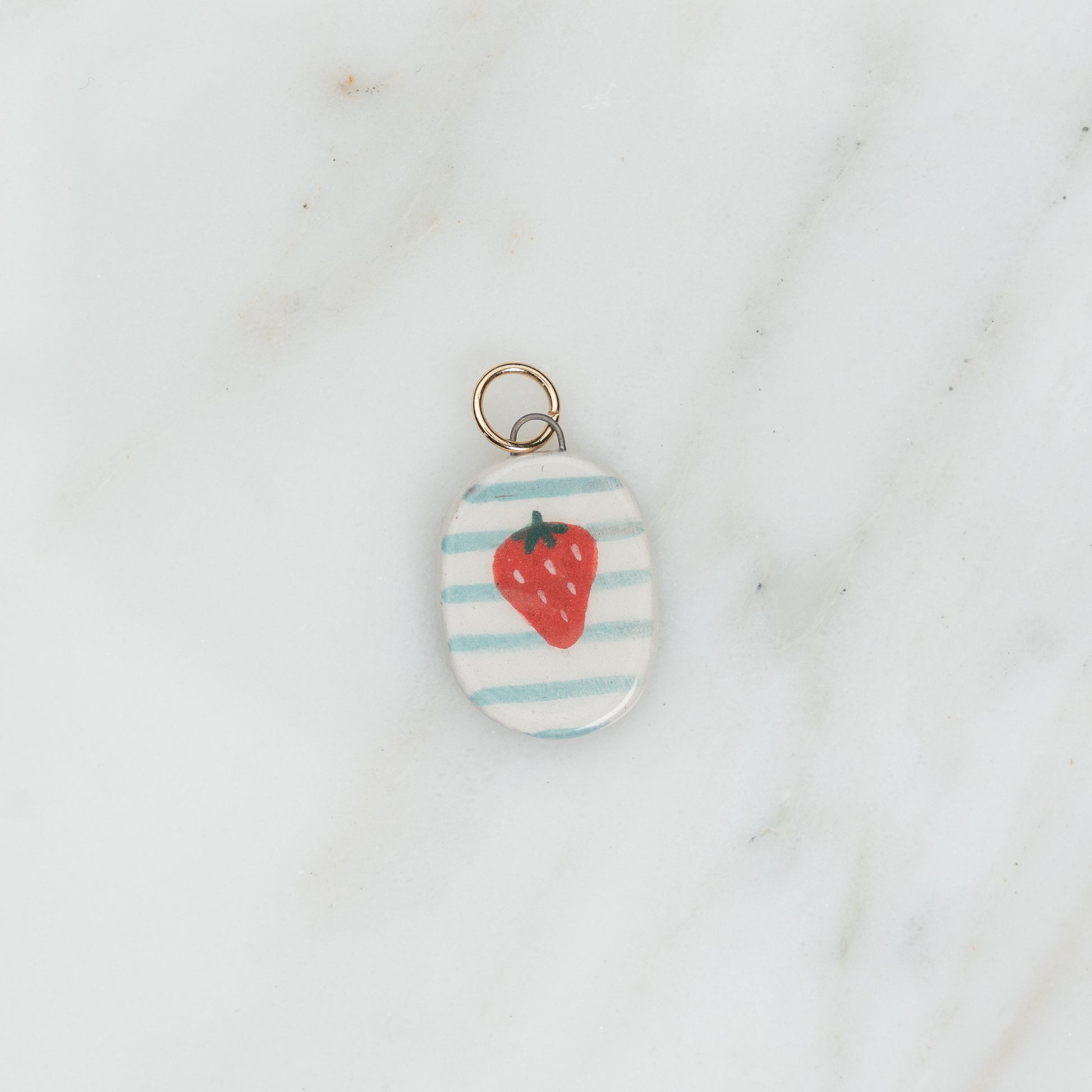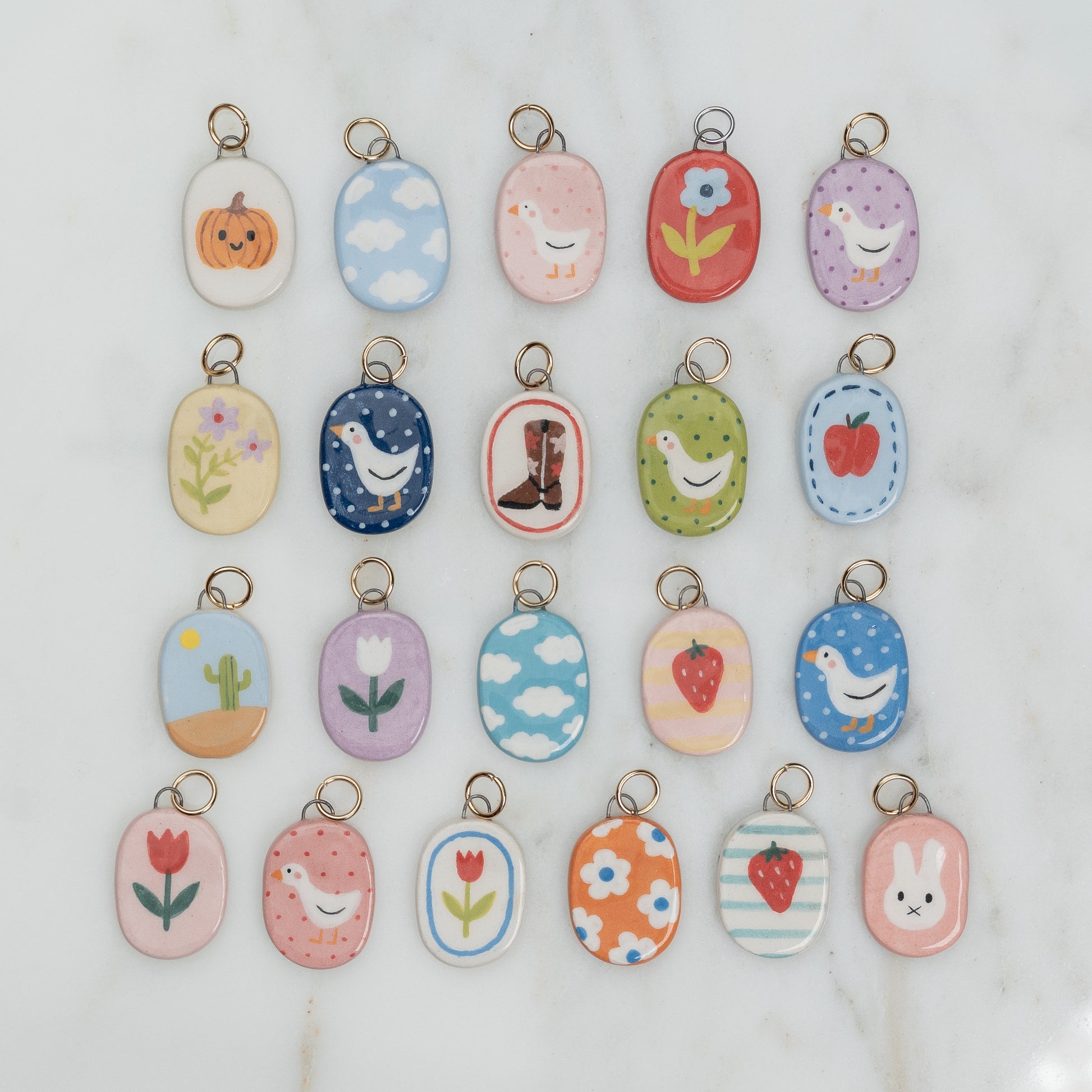 Ciondolini in ceramica interamente realizzati a mano. Anella in acciaio inossidabile. Dimensioni del ciondolo: 2 cm x 1,5 cm.