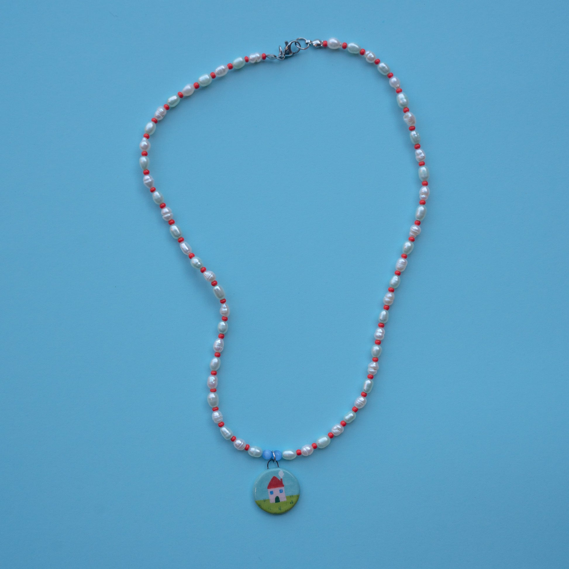 Collana con perline colorate in vetro, perle di fiume e ciondolo tondo con casetta in ceramica fatto a mano. Chiusura in acciaio inossidabile.