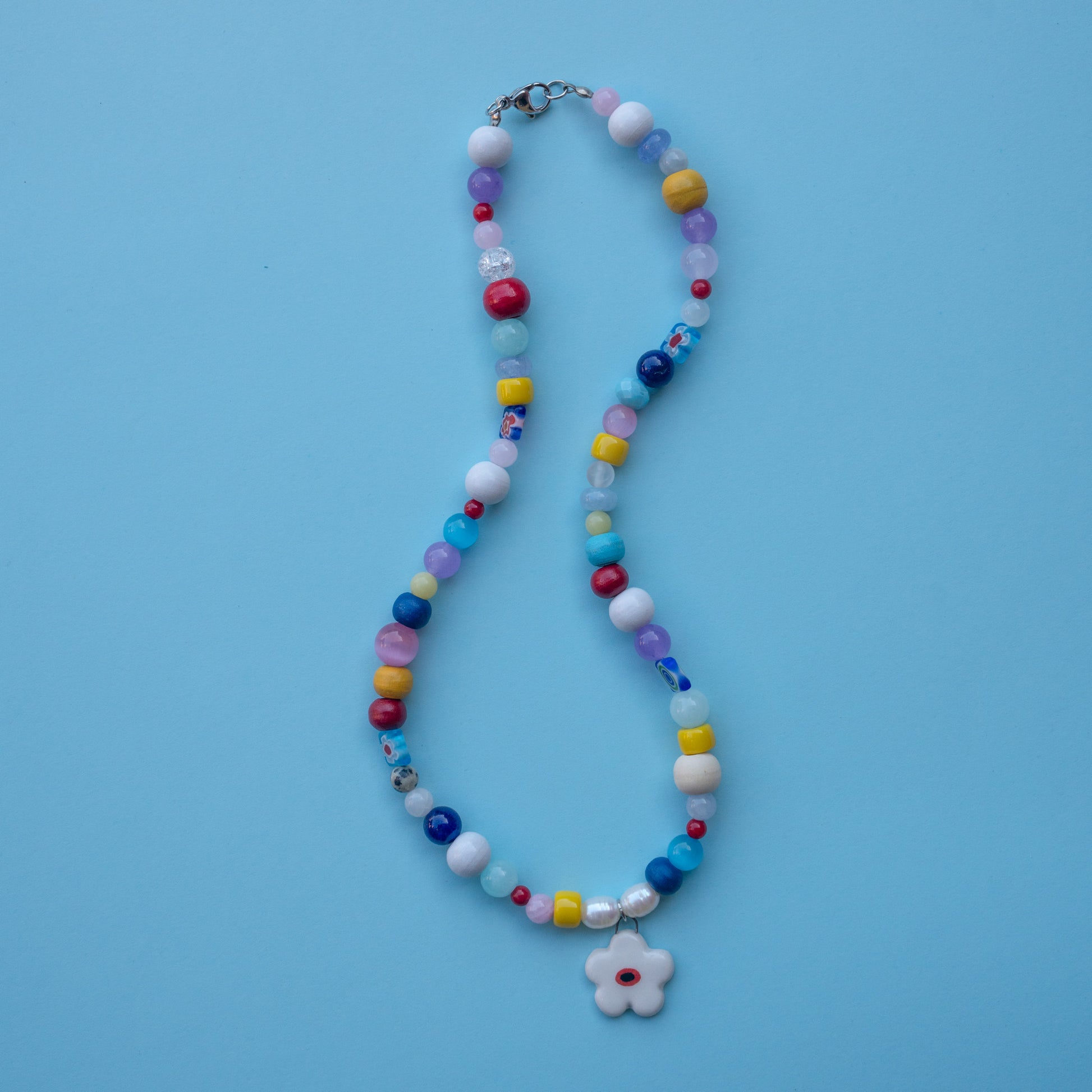 Collana con perline colorate in vetro, perle di fiume, perline in pietra dura e ciondolo fiore in ceramica fatto a mano. Chiusura in acciaio inossidabile.