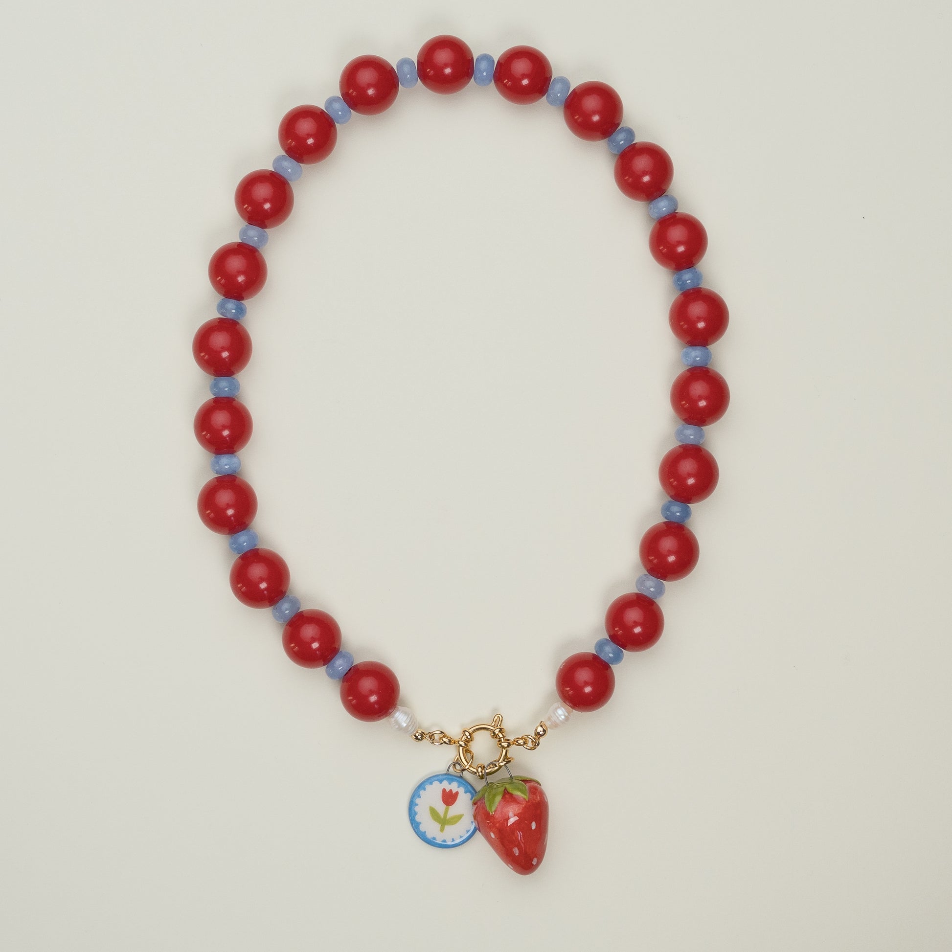 Collana con perline in pietra dura, perline in plastica, perle di fiume e coppia di ciondoli in ceramica fatti a mano (ciondolo tondo con tulipano e fragolona). Moschettone in acciaio inossidabile. I ciondoli sono rimovibili.