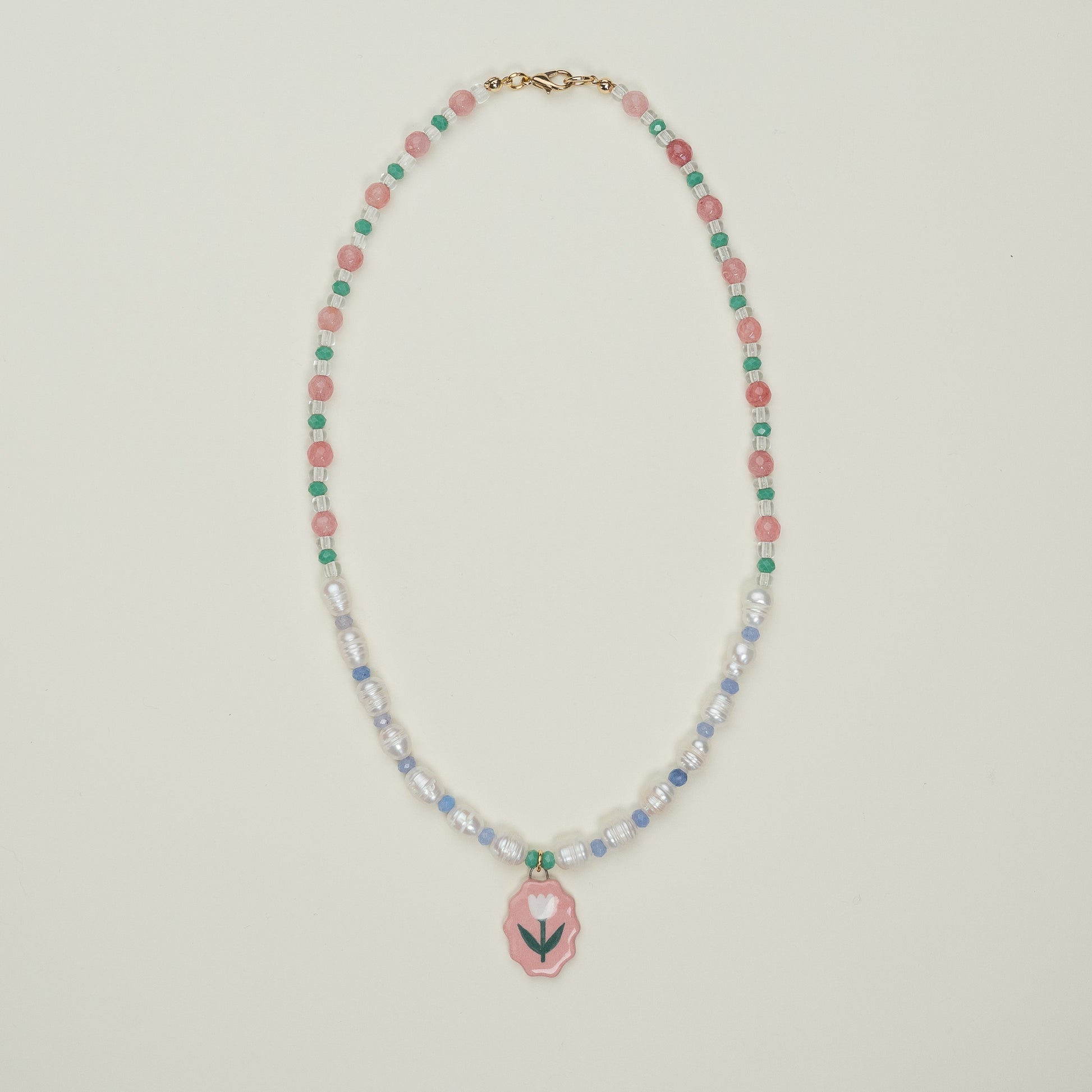 Collana con perle di fiume, perline in vetro, perline in pietra dura e ciondolo con tulipano in ceramica fatto a mano. Chiusura in acciaio inossidabile.
