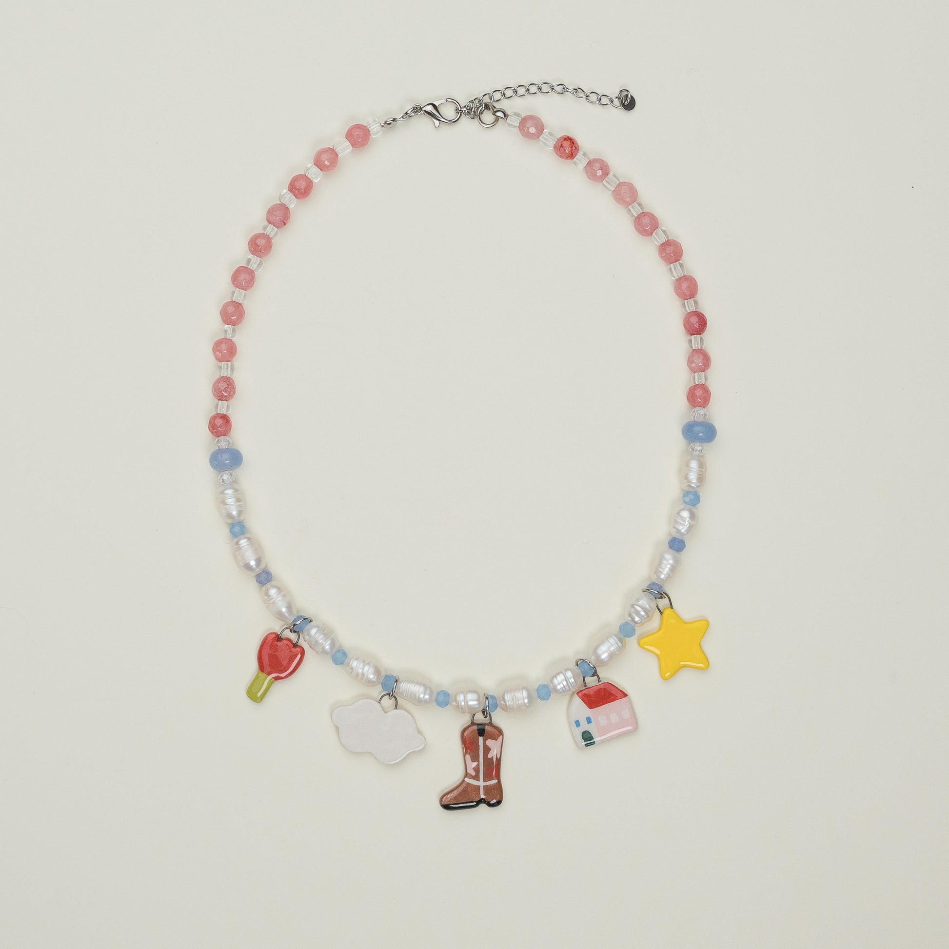 Collana con perline in vetro, perline in pietra dura, perle di fiume e ciondoli in ceramica fatti a mano (tulipano, nuvoletta, stivale texano, casetta, stellina). Chiusura in acciaio inossidabile.