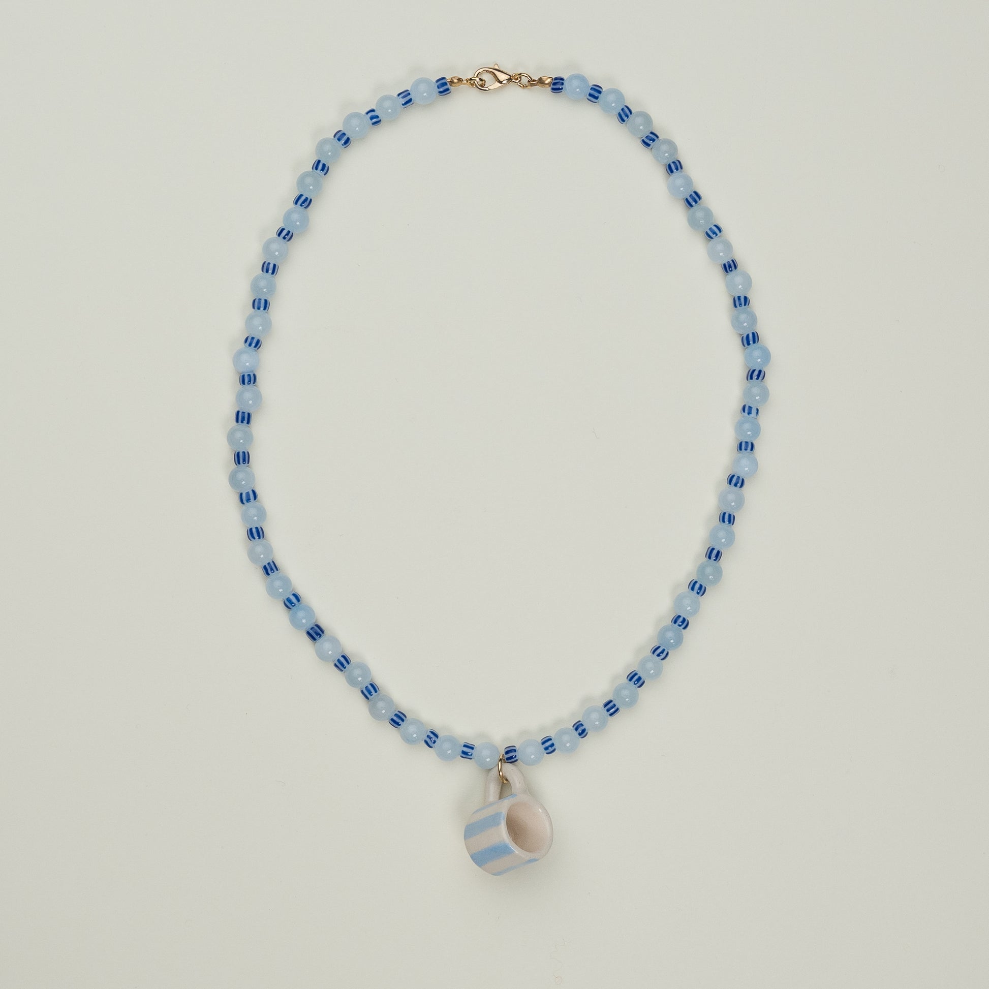 Collana con perline colorate in vetro, perline in pietra dura e mini tazzina in ceramica fatta a mano. Chiusura in acciaio inossidabile.