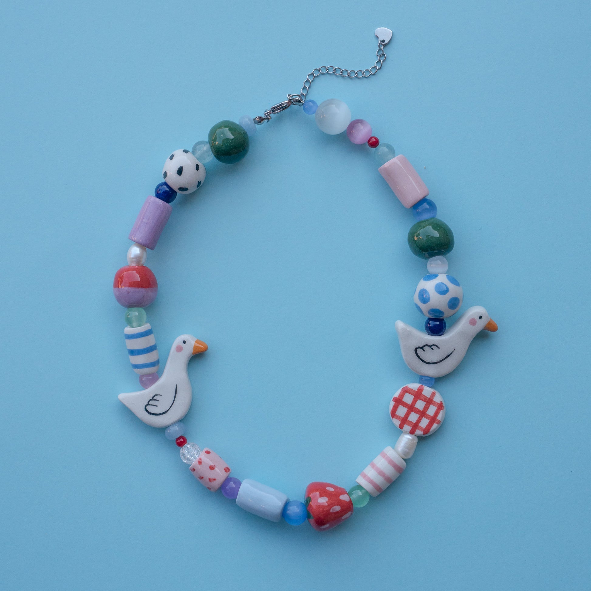 Collana con perle di fiume, perle in pietra dura e perline in vetro. Perle in ceramica colorate e paperelle in ceramica realizzate a mano. Chiusura in acciaio inossidabile.