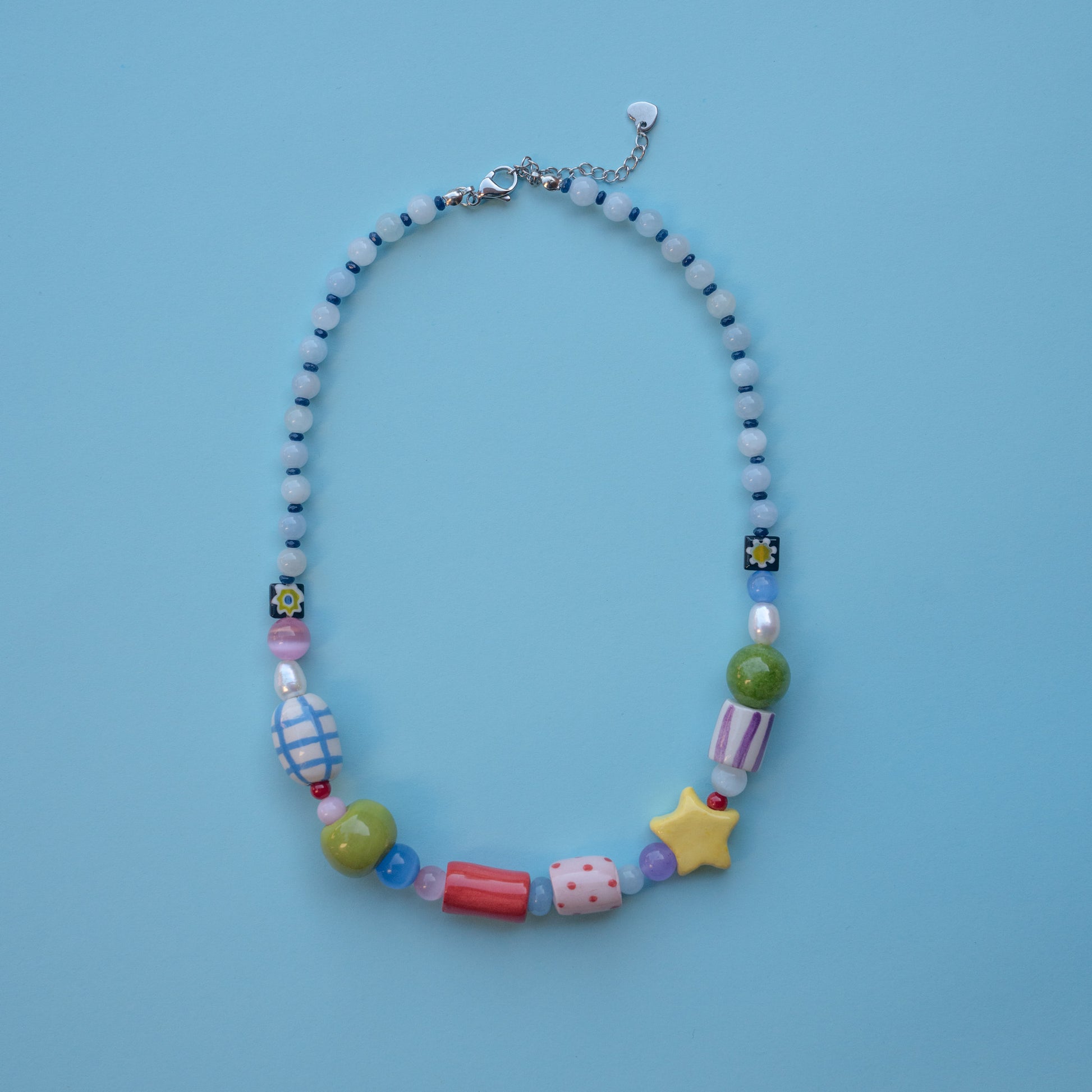 Collana con perle di fiume, perline in pietra dura e perline in ceramica fatte a mano. Chiusura in acciaio inossidabile.