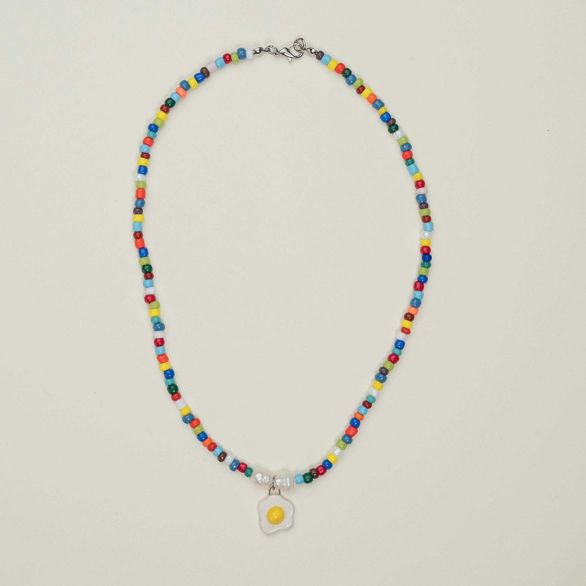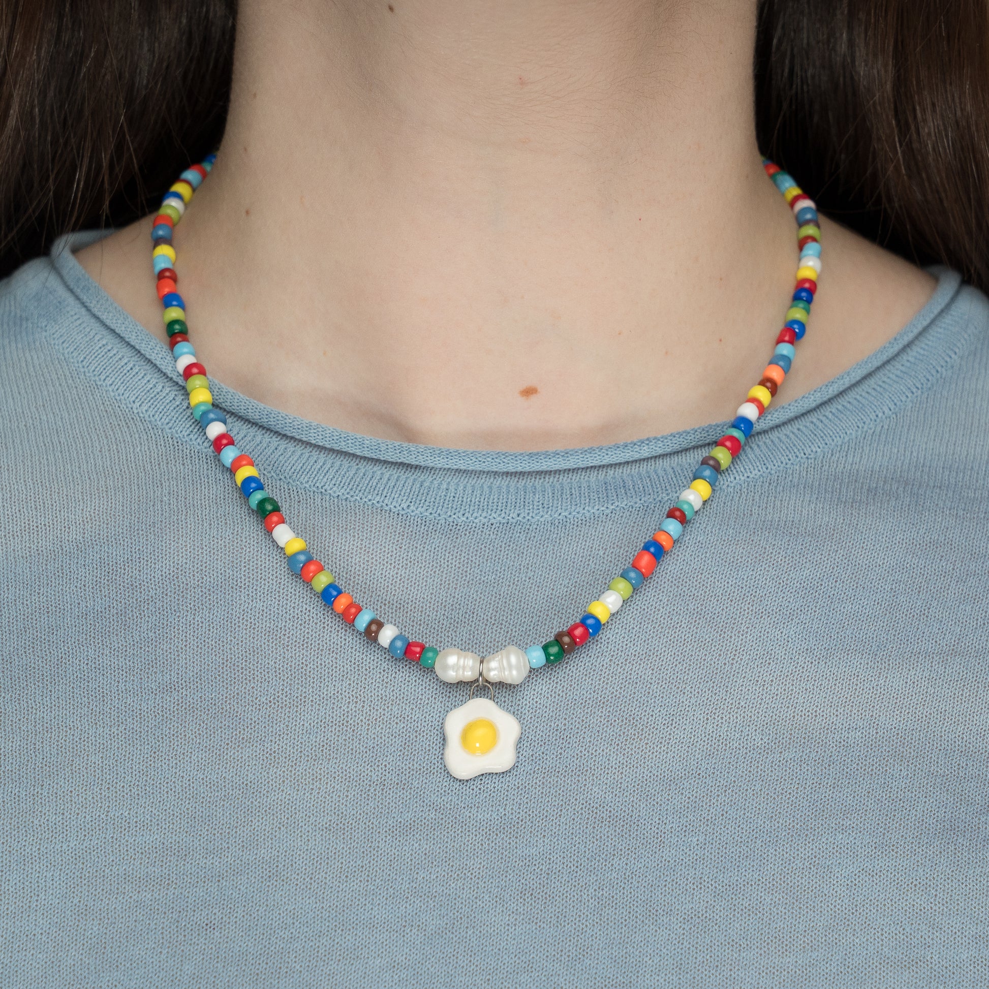 Collana con perline colorate in vetro, perle di fiume e ciondolo uovo in ceramica fatto a mano. Chiusura in acciaio inossidabile.