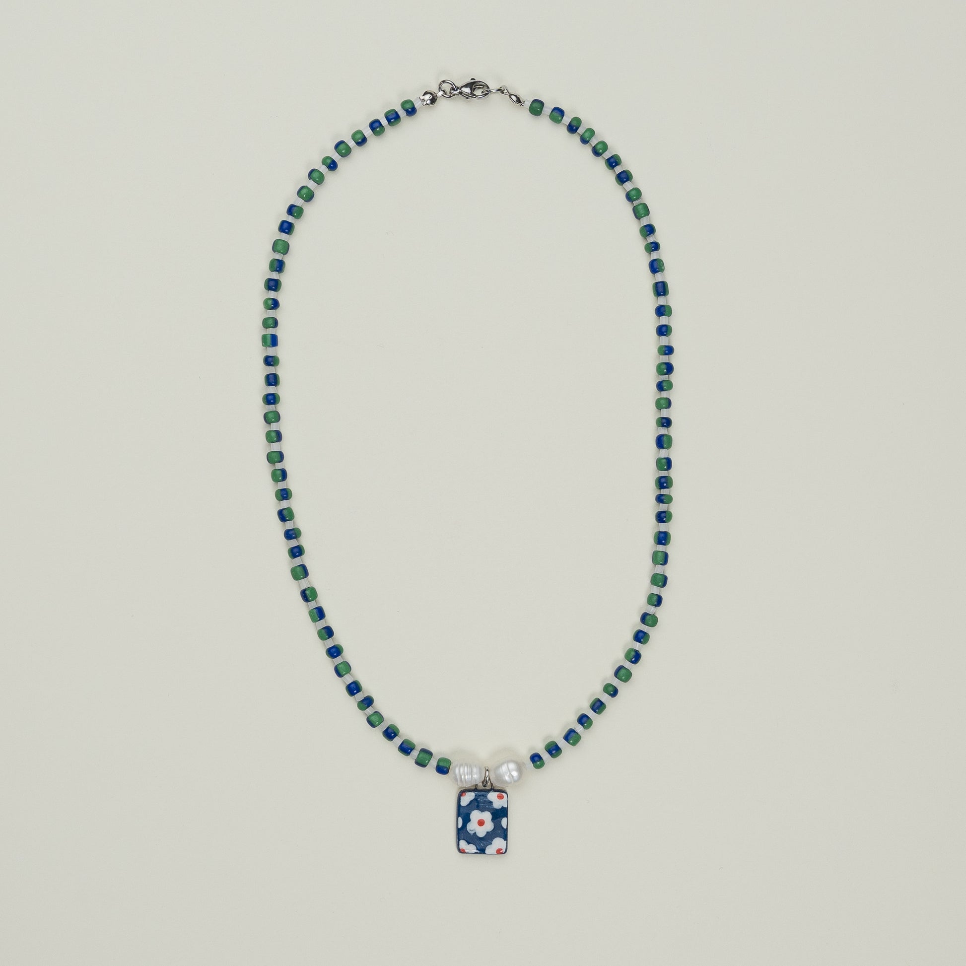 Collana con perline colorate in vetro, perle di fiume e ciondolo in ceramica fatto a mano (rettangolare blu con fiorellini bianchi). Chiusura in acciaio inossidabile.