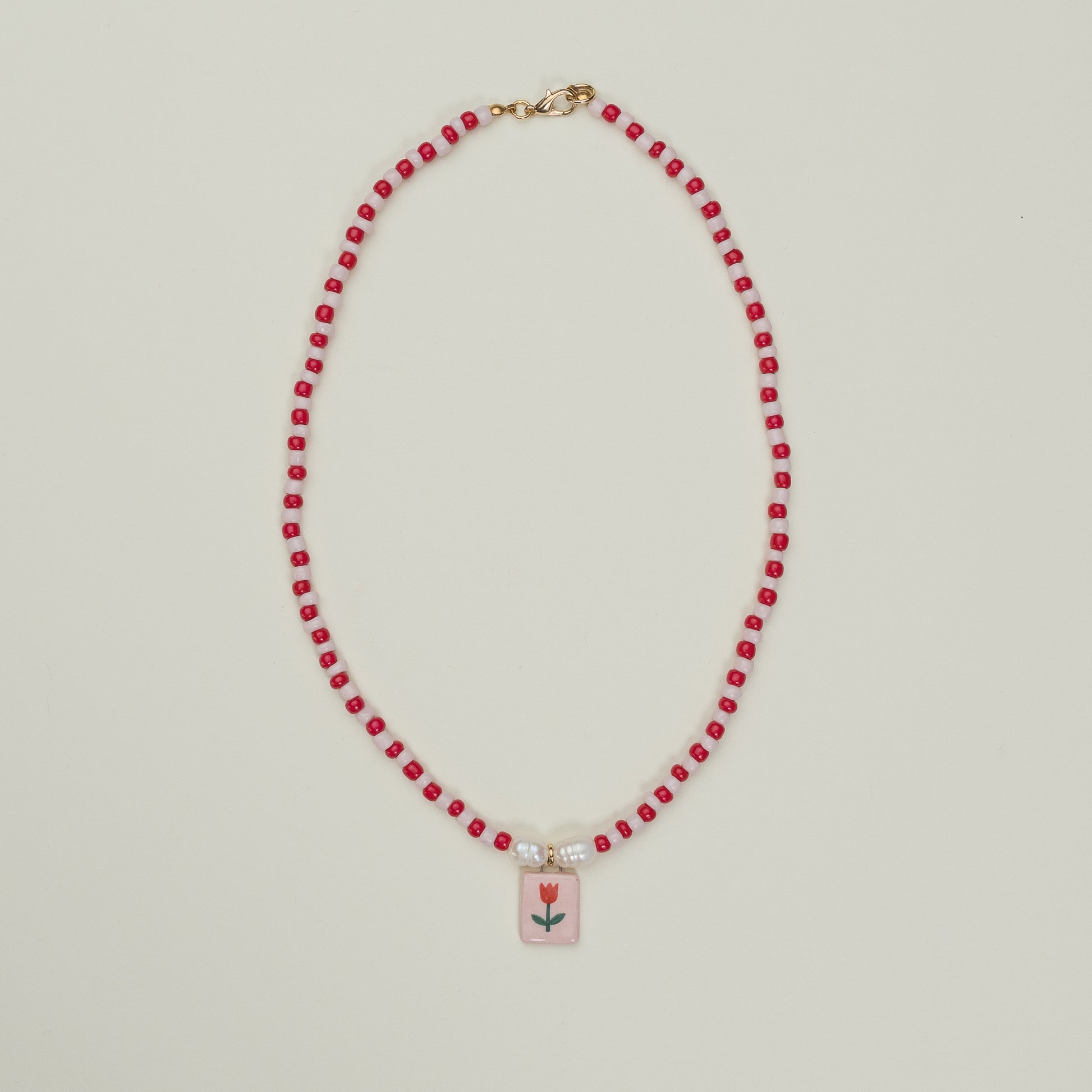 Collana con perline in vetro, perle di fiume e ciondolo rettangolare con tulipano fatto a mano in ceramica. Chiusura in acciaio inossidabile.