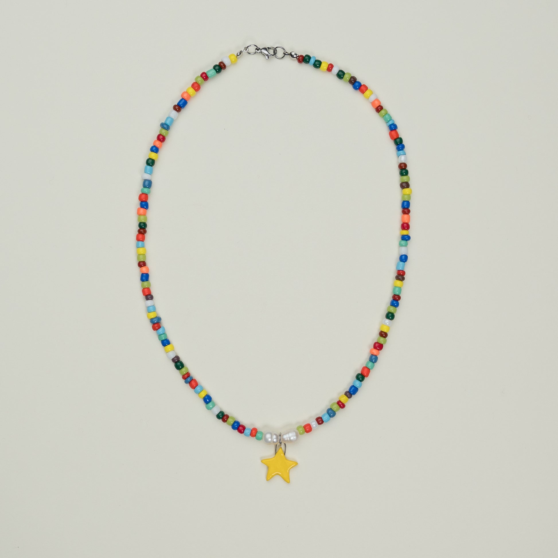 Collana con perline colorate in vetro, perle di fiume e ciondolo stellina in ceramica fatto a mano. Chiusura in acciaio inossidabile.