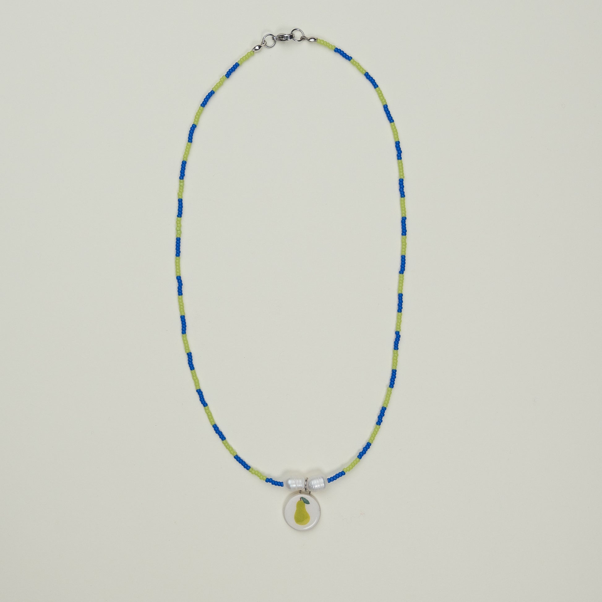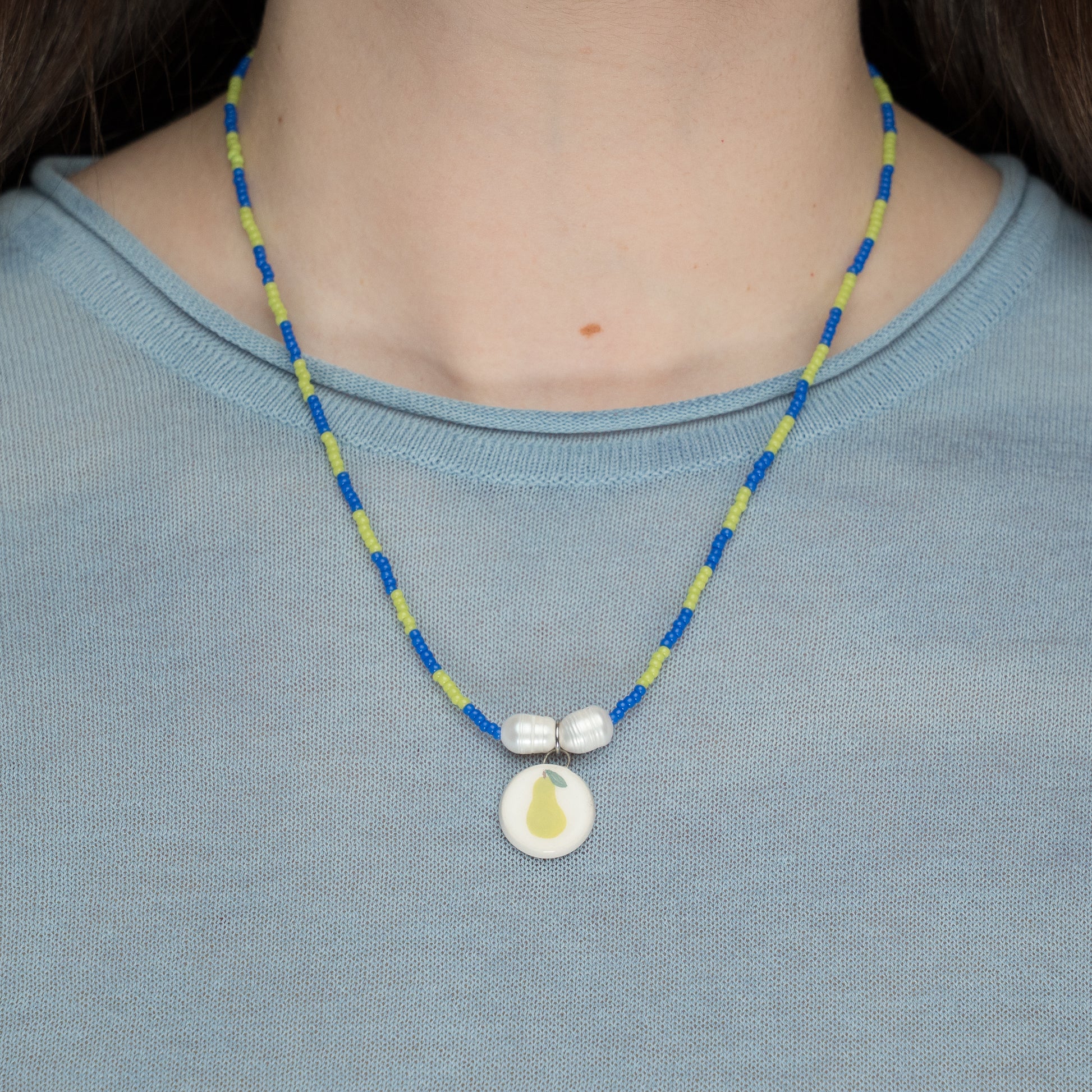 Collana con micro perline in vetro, perle di fiume e ciondolo in ceramica fatto a mano (tondo con pera). Chiusura in acciaio inossidabile.