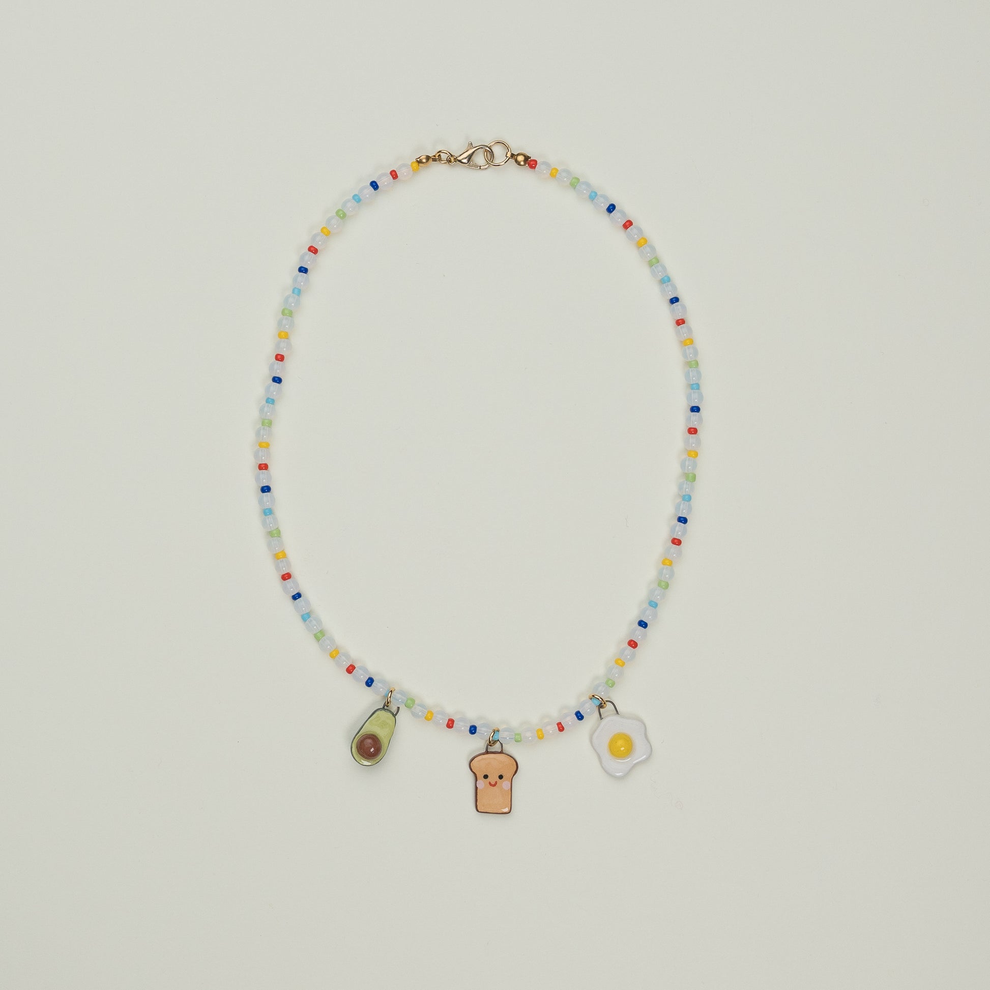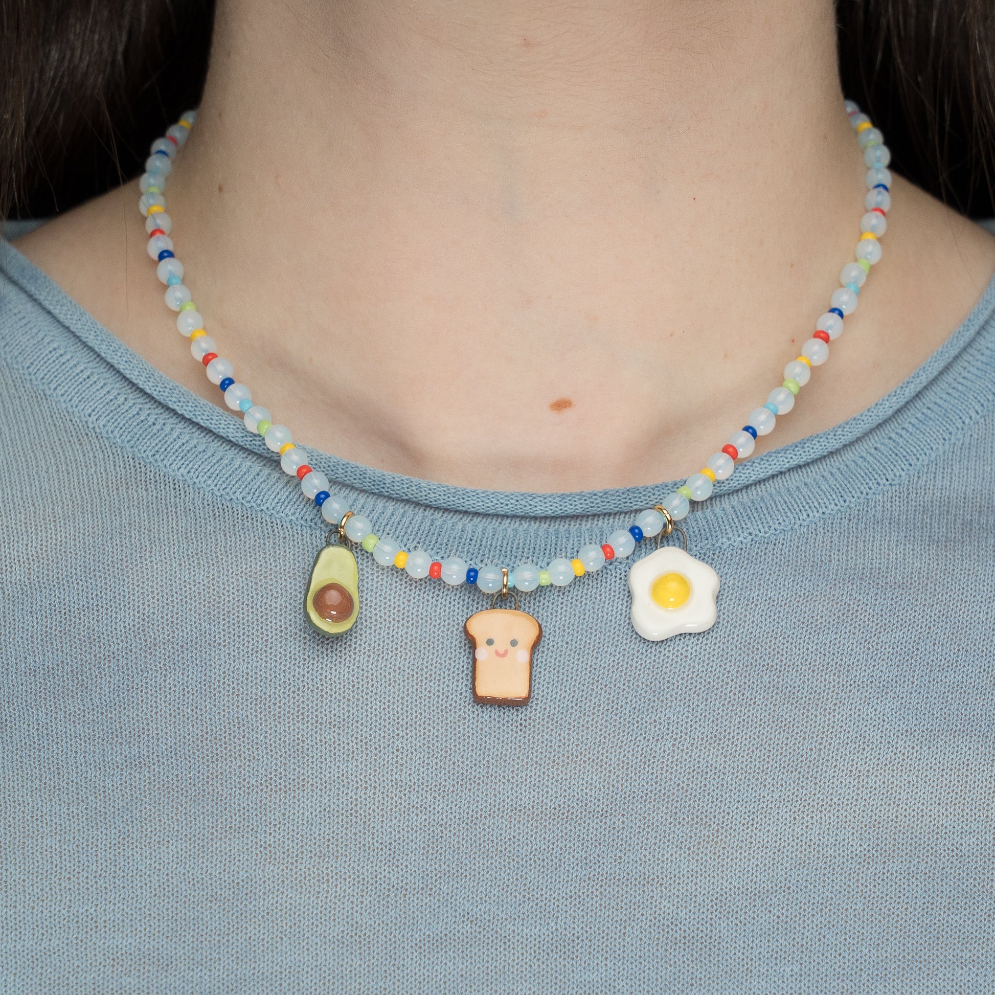 Collana con perline in pietra dura, perline colorate in vetro e tris di ciondoli in ceramica fatti a mano (pane, uovo, avocado). Chiusura in acciaio inossidabile.
