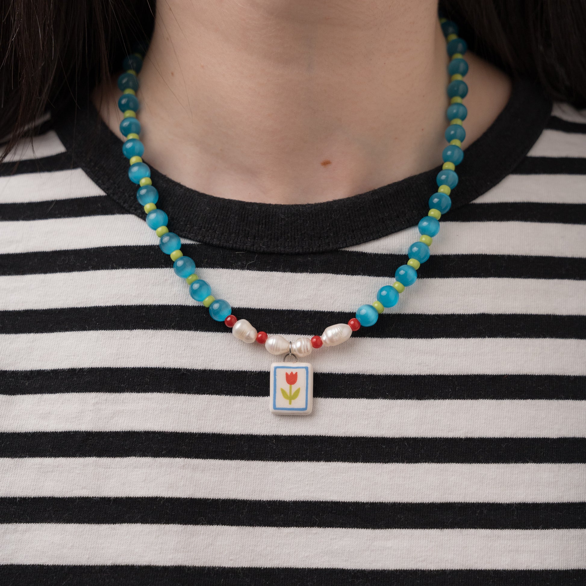 Collana con perline in pietra dura, perle di fiume, perline in vetro e ciondolo in ceramica fatto a mano (rettangolare con tulipano). Chiusura in acciaio inossidabile.