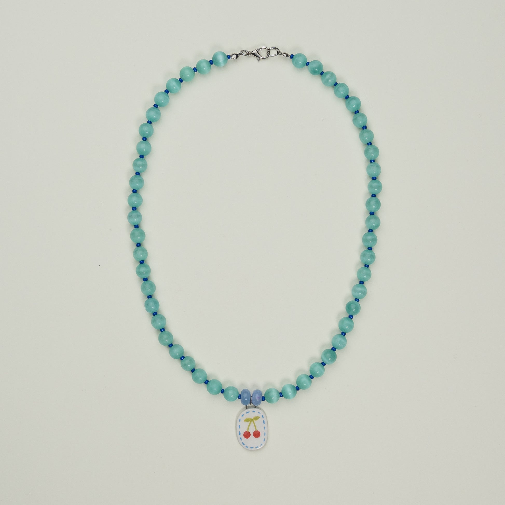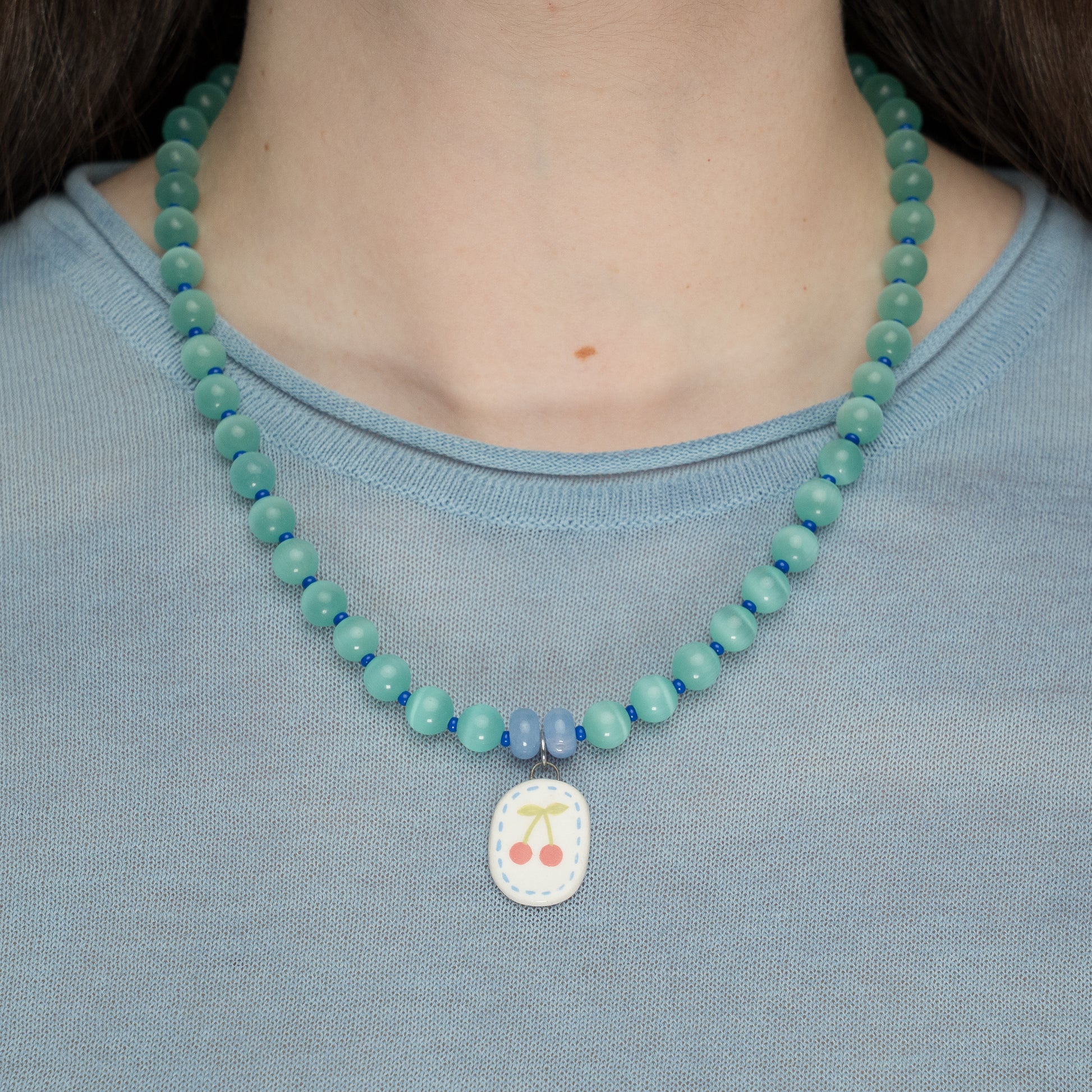 Collana con perline in pietra dura, perline in vetro e ciondolo in ceramica fatto a mano (ovale con ciliegie). Chiusura in acciaio inossidabile.