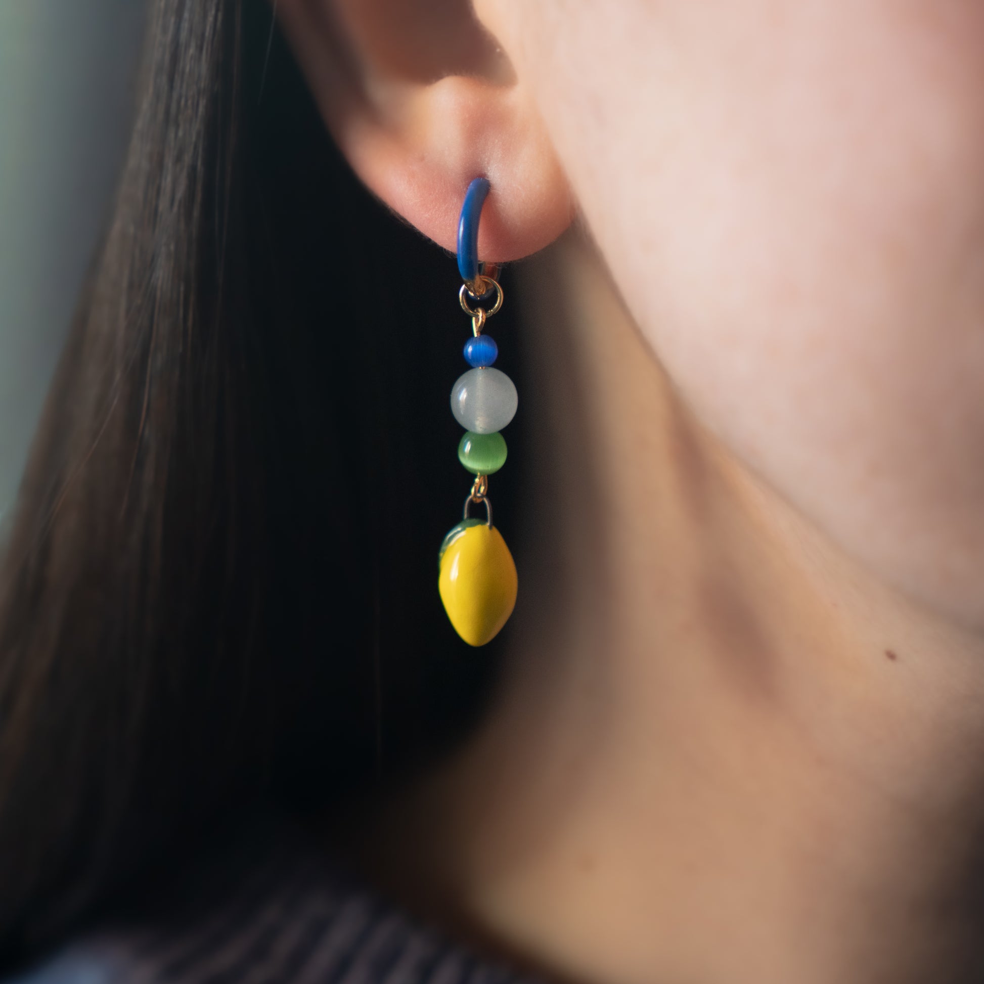 Coppia di orecchini pendenti con limoni in ceramica fatti a mano e perline in pietra dura.