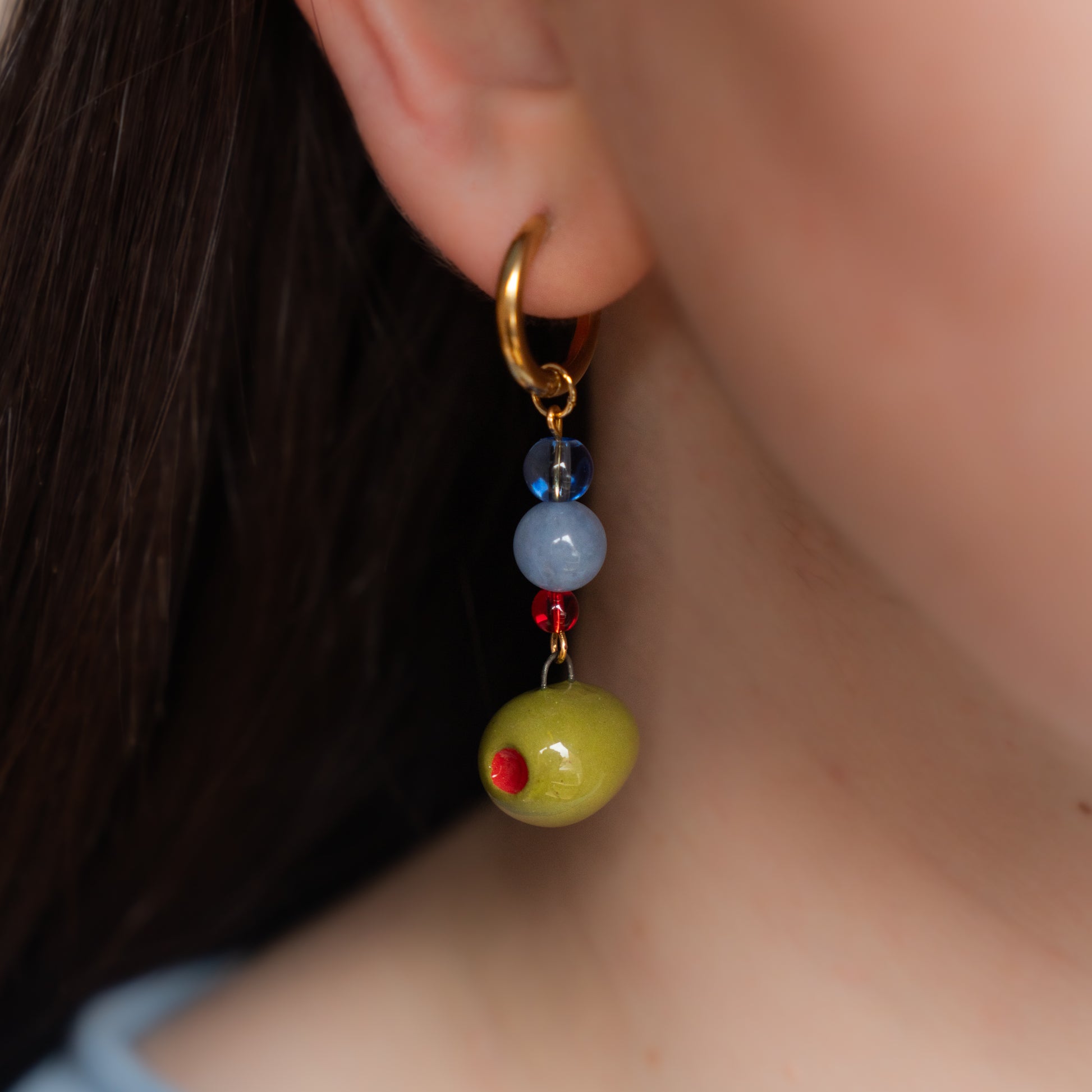 Coppia di orecchini pendenti con olive in ceramica fatte a mano e perline in pietra dura.