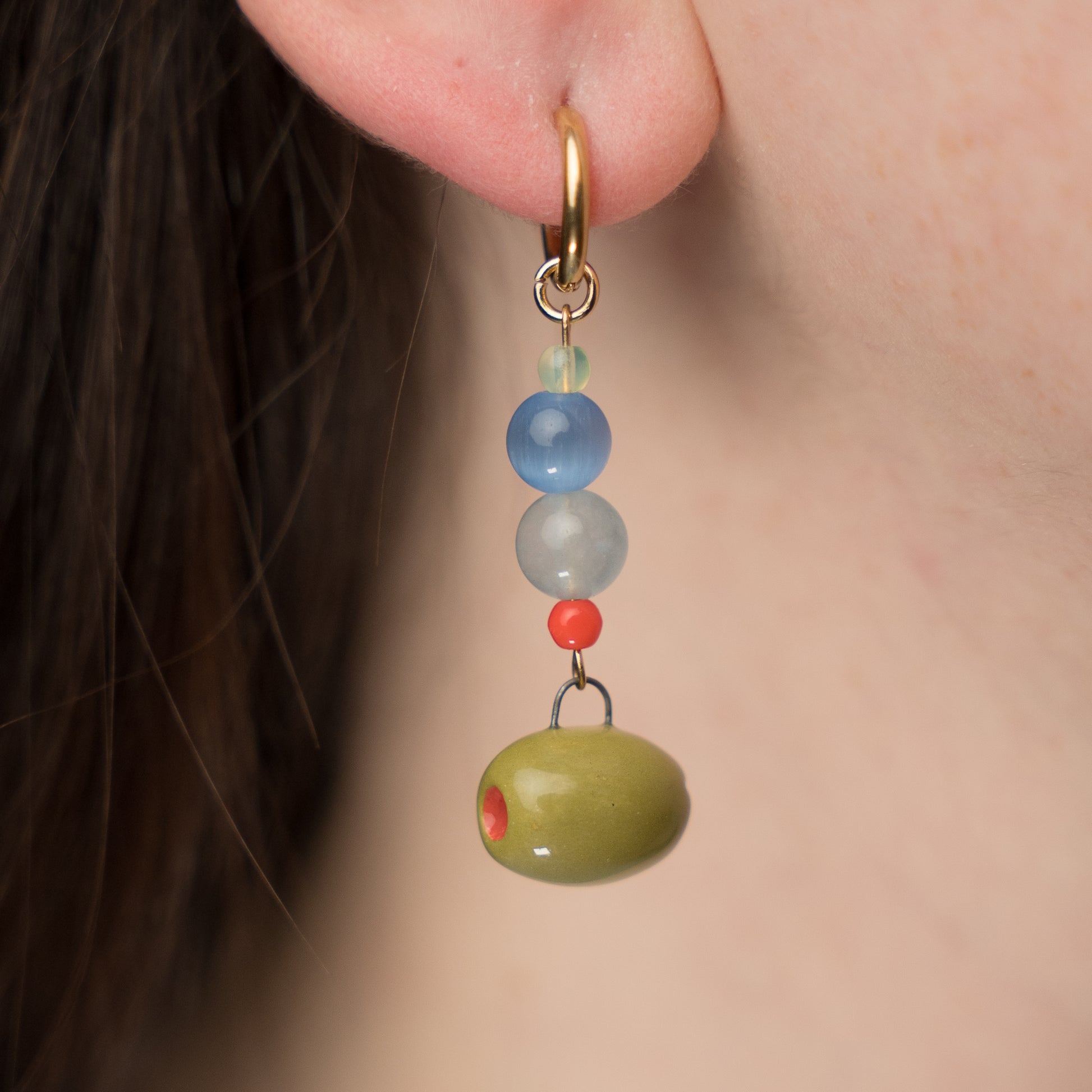 Coppia di orecchini pendenti con olive in ceramica fatte a mano e perline in pietra dura.