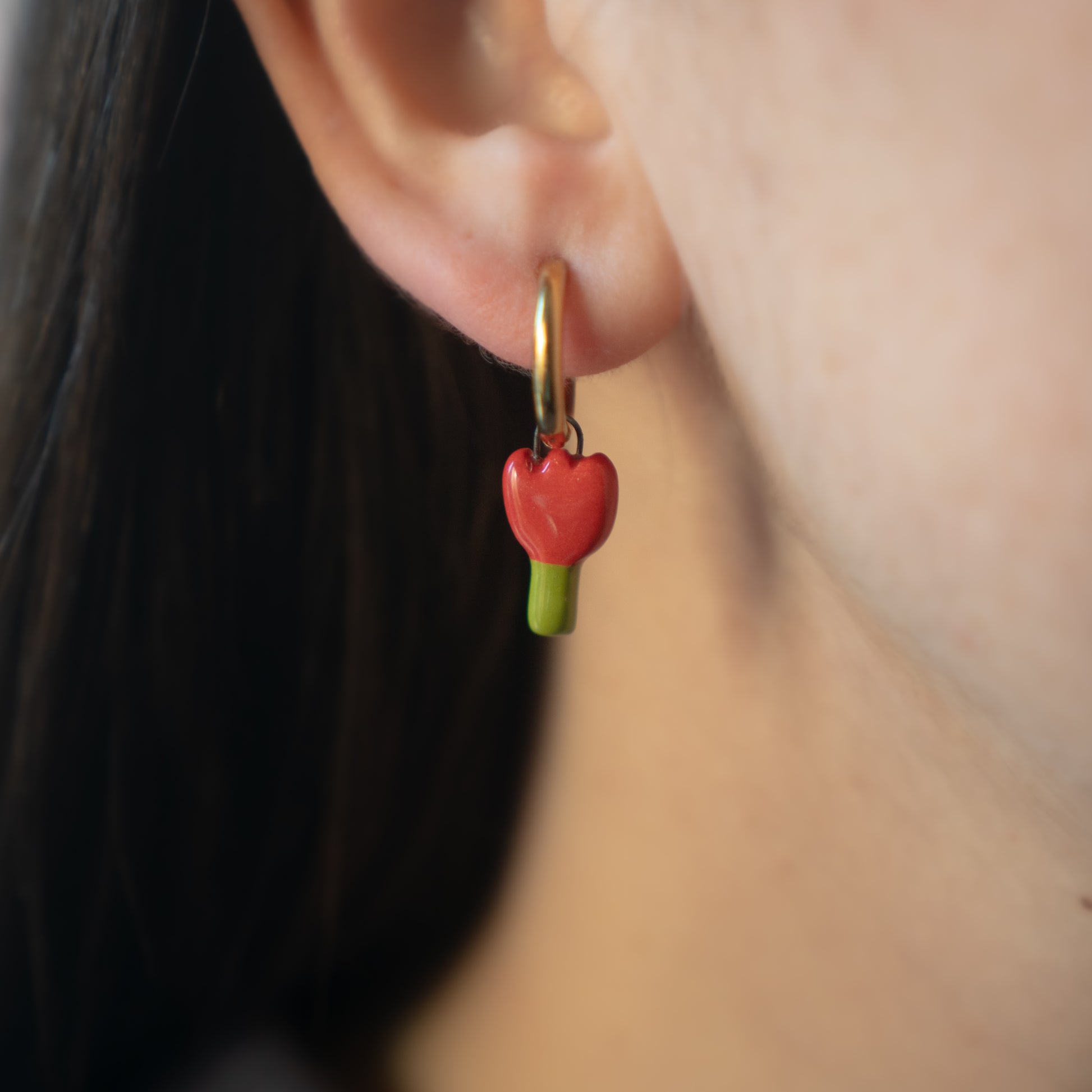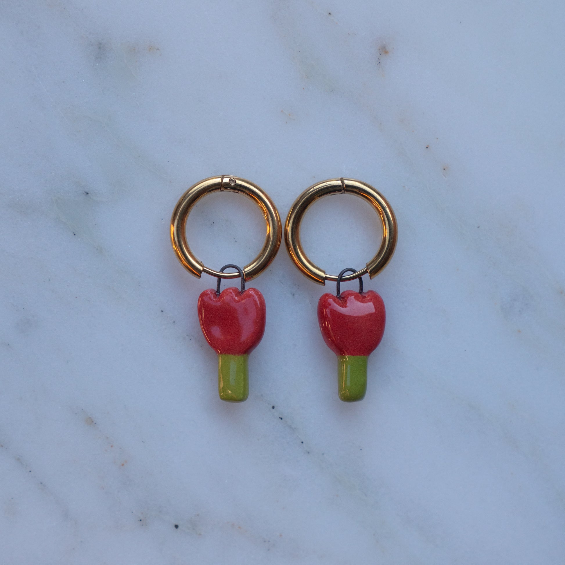Orecchini ad anella con ciondoli in ceramica realizzati a mano. Diametro anelle: 15 mm.