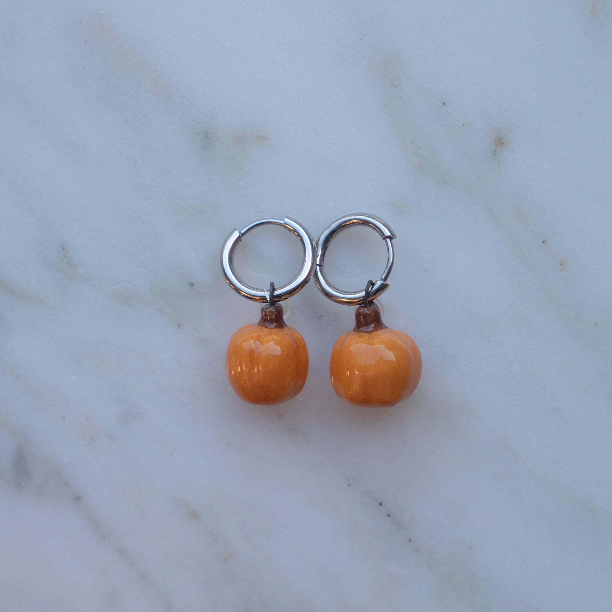 Orecchini ad anella con ciondoli in ceramica realizzati a mano. Diametro anelle: 15 mm.