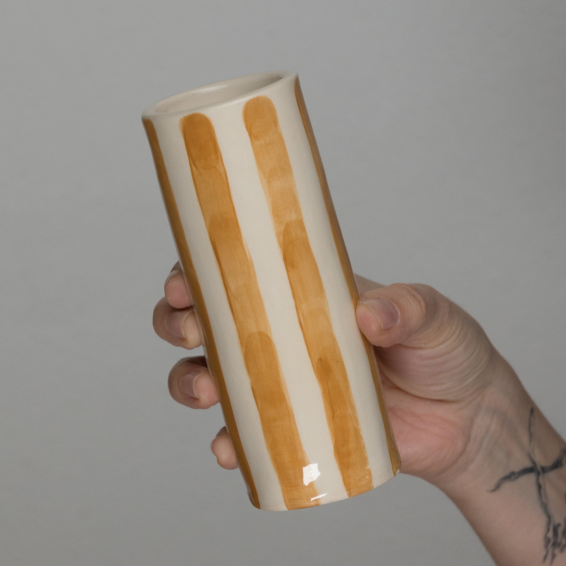 Vasetto a righe beige in ceramica interamente realizzato a mano.