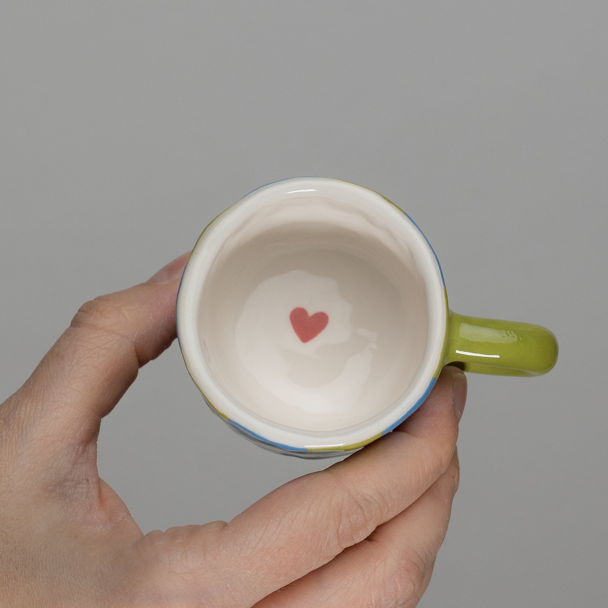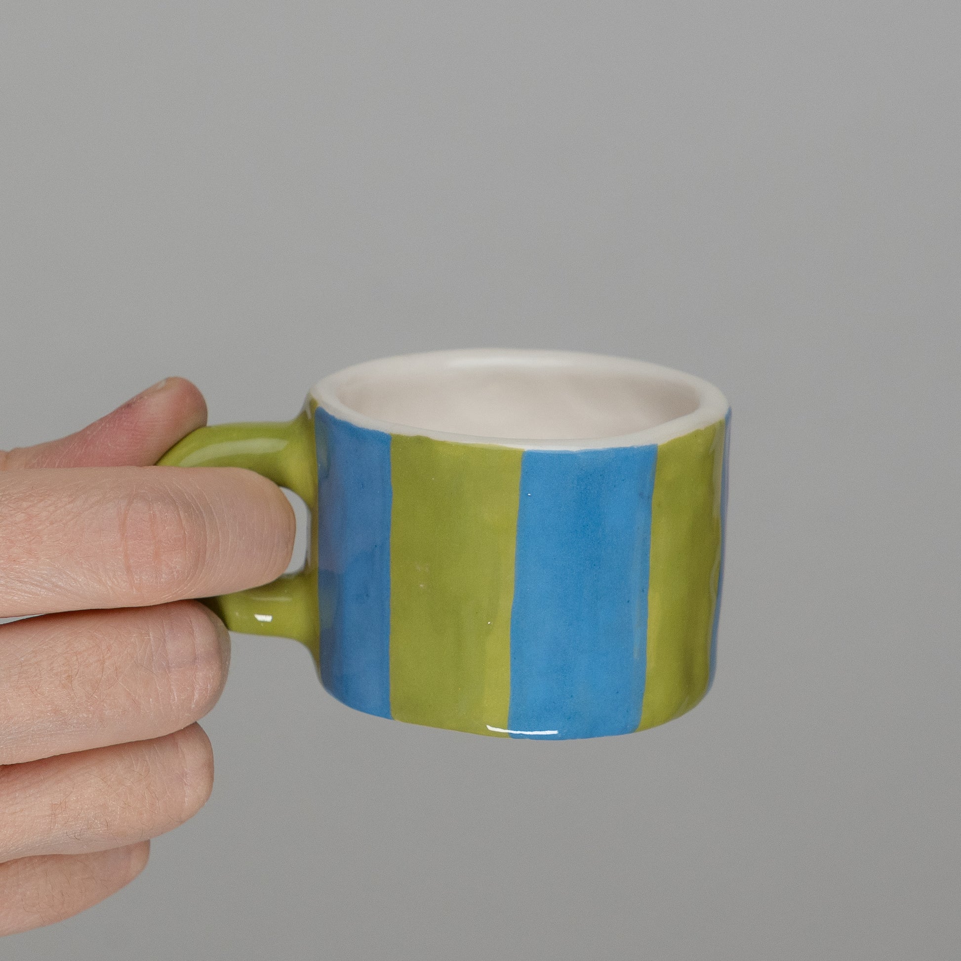 Tazzina a righe verdi e azzurre, modellata a mano con la tecnica del pizzicato. Dimensioni indicative: altezza 4 cm, diametro 6 cm.
