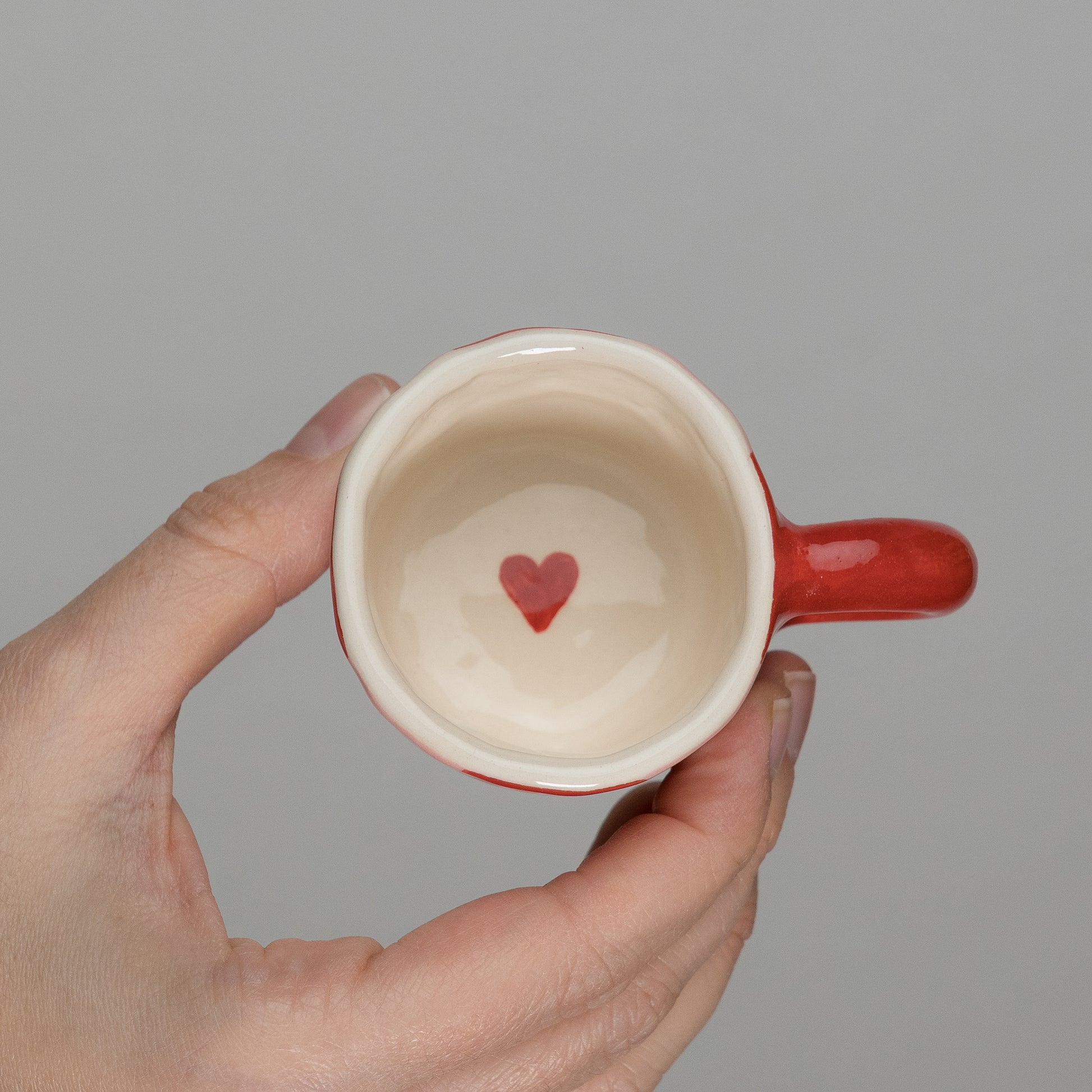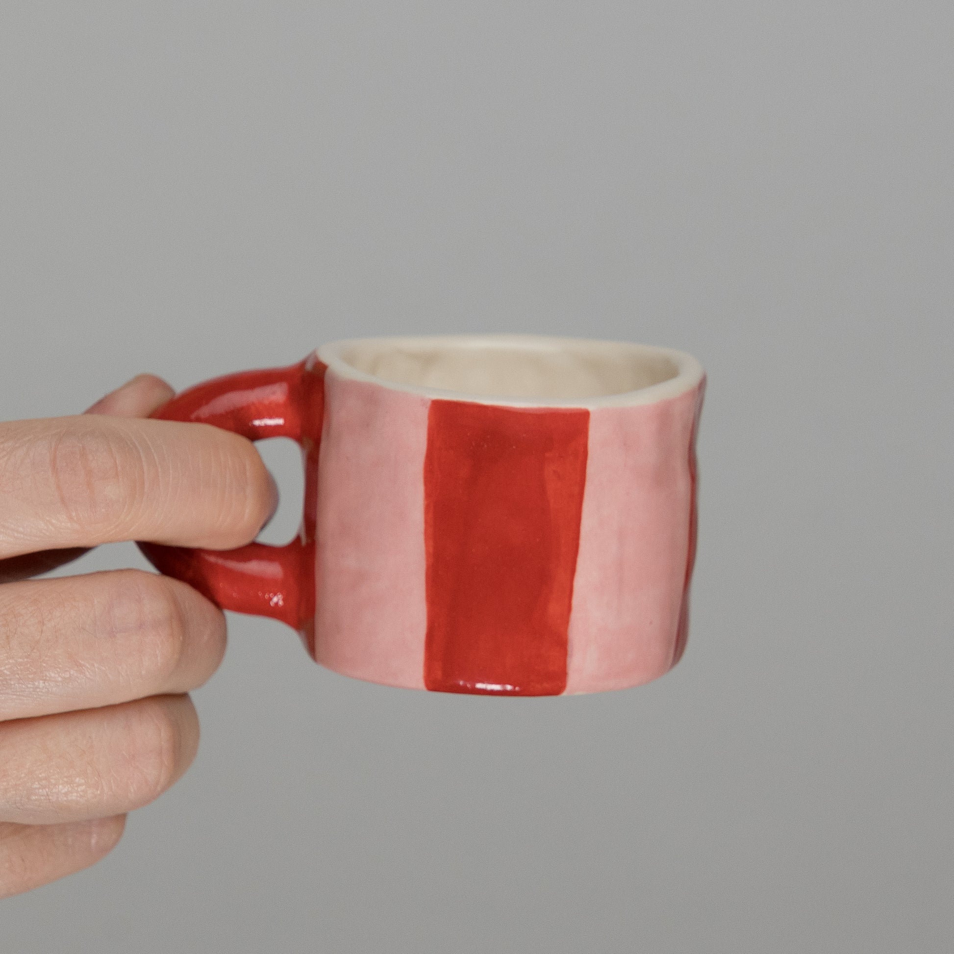 Tazzina a righe rosse e rosa, modellata a mano con la tecnica del pizzicato. Dimensioni indicative: altezza 4 cm, diametro 6 cm.
