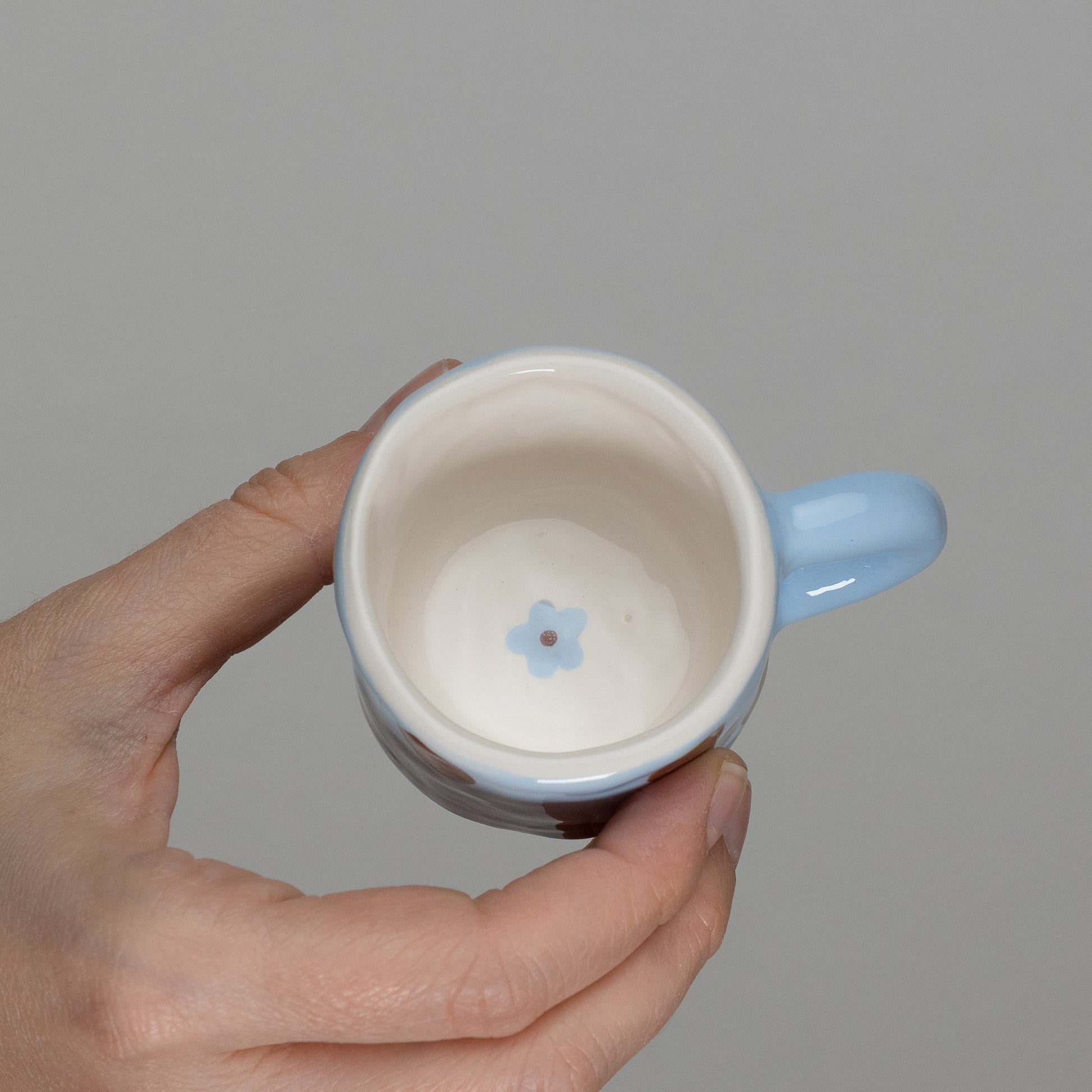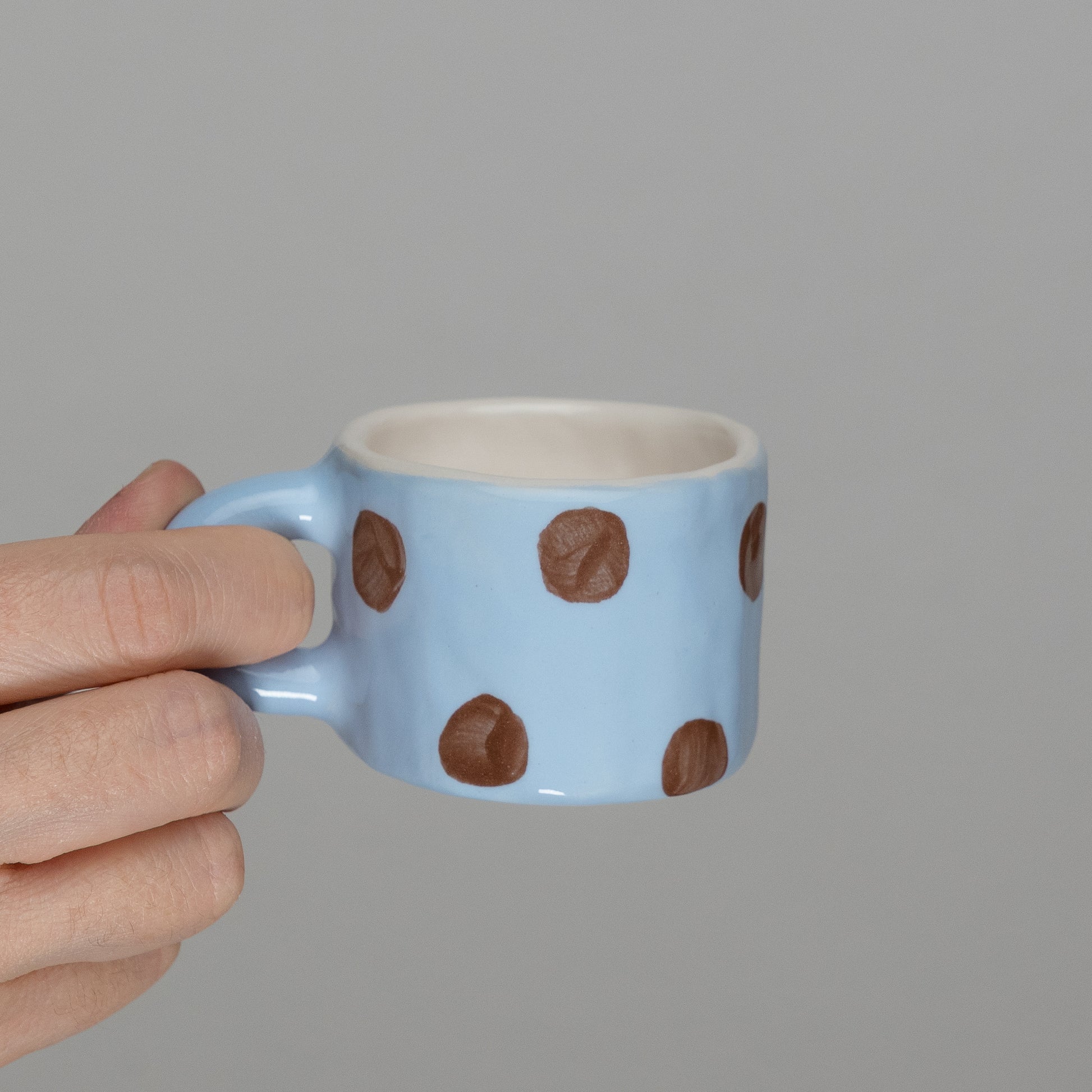 Tazzina azzurra con pois marroni, modellata a mano con la tecnica del pizzicato. Dimensioni indicative: altezza 4 cm, diametro 6 cm.