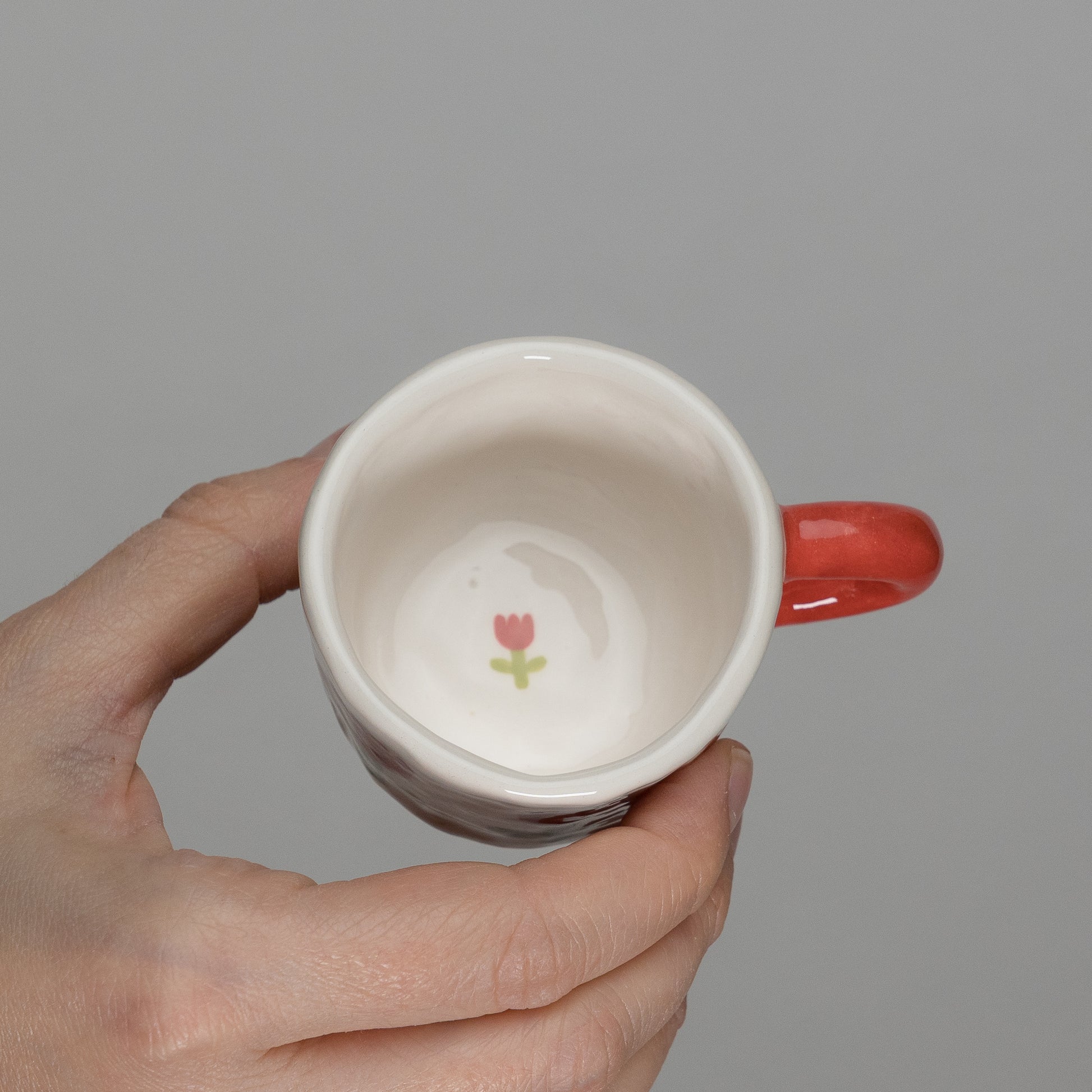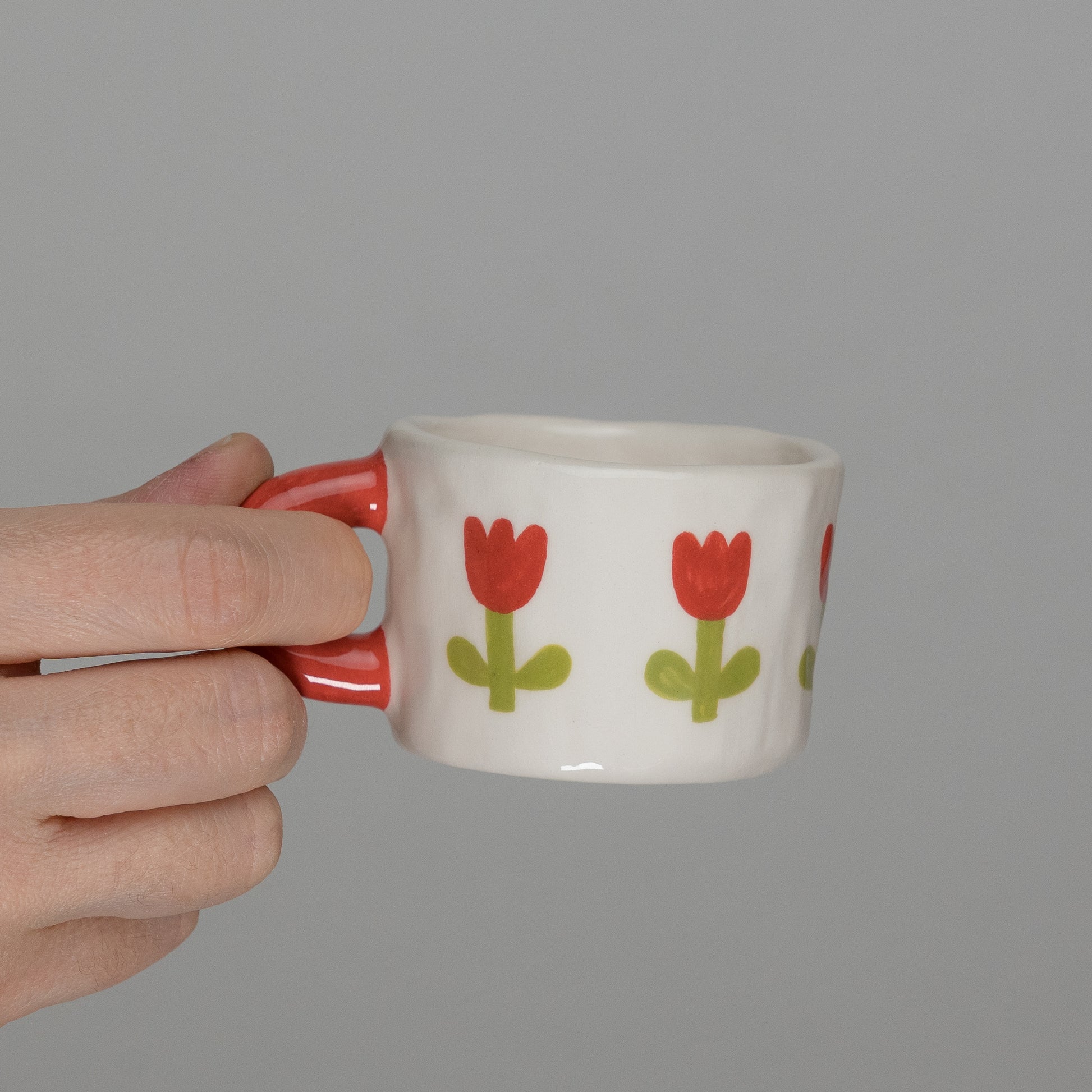 Tazzina con pattern di tulipani e manico rosso, modellata a mano con la tecnica del pizzicato. Misure indicative: altezza 4 cm, diametro 6 cm.