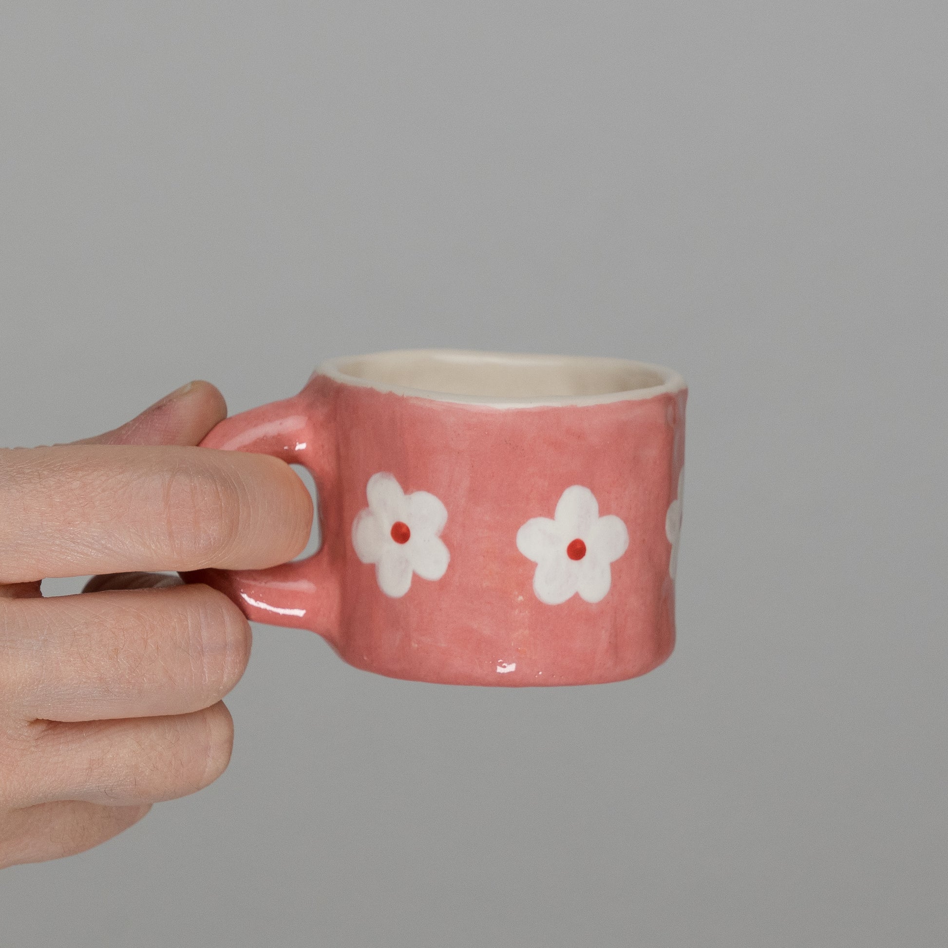 Tazzina rosa con pattern di fiorellini bianchi, modellata a mano con la tecnica del pizzicato. Misure indicative: altezza 4 cm, diametro 6 cm.