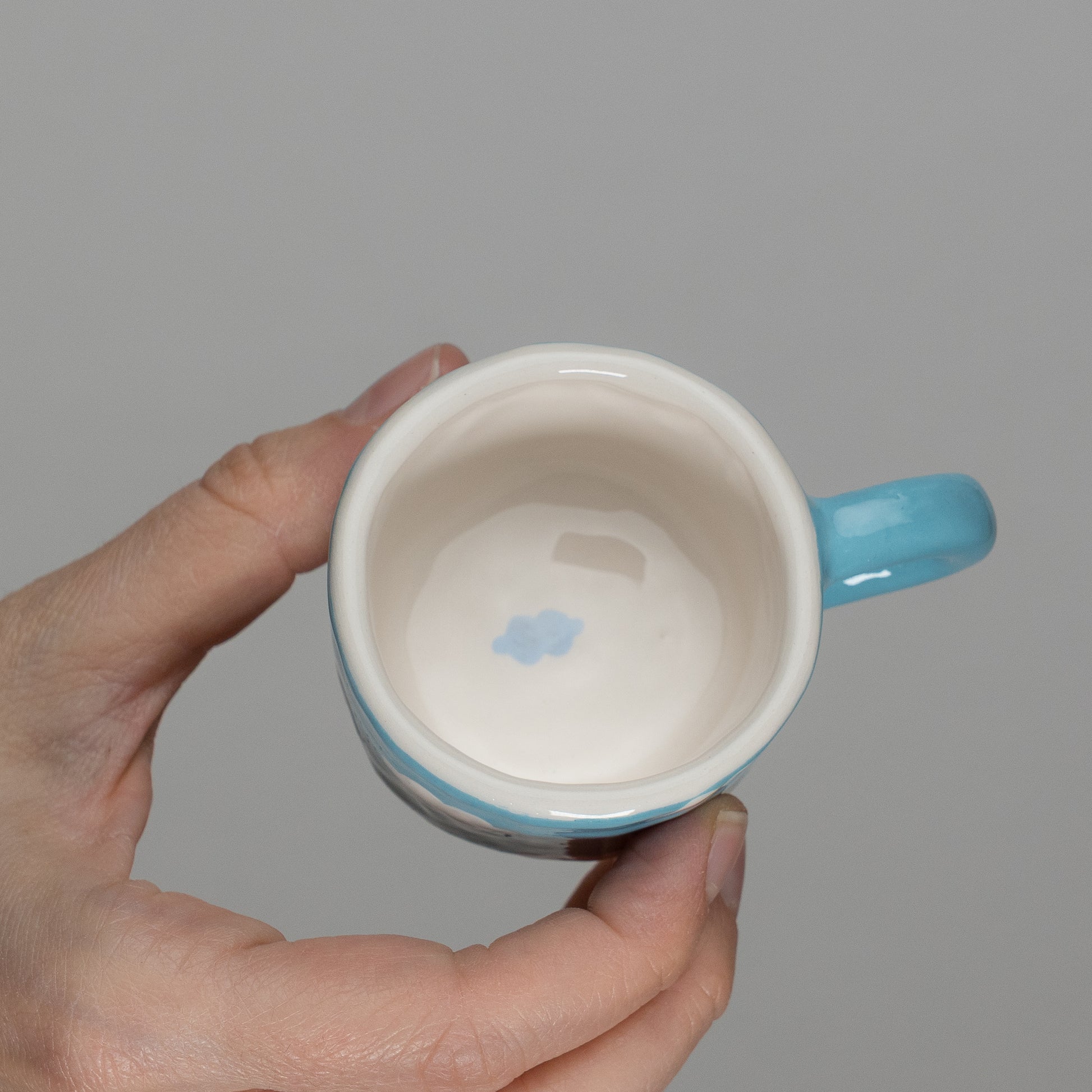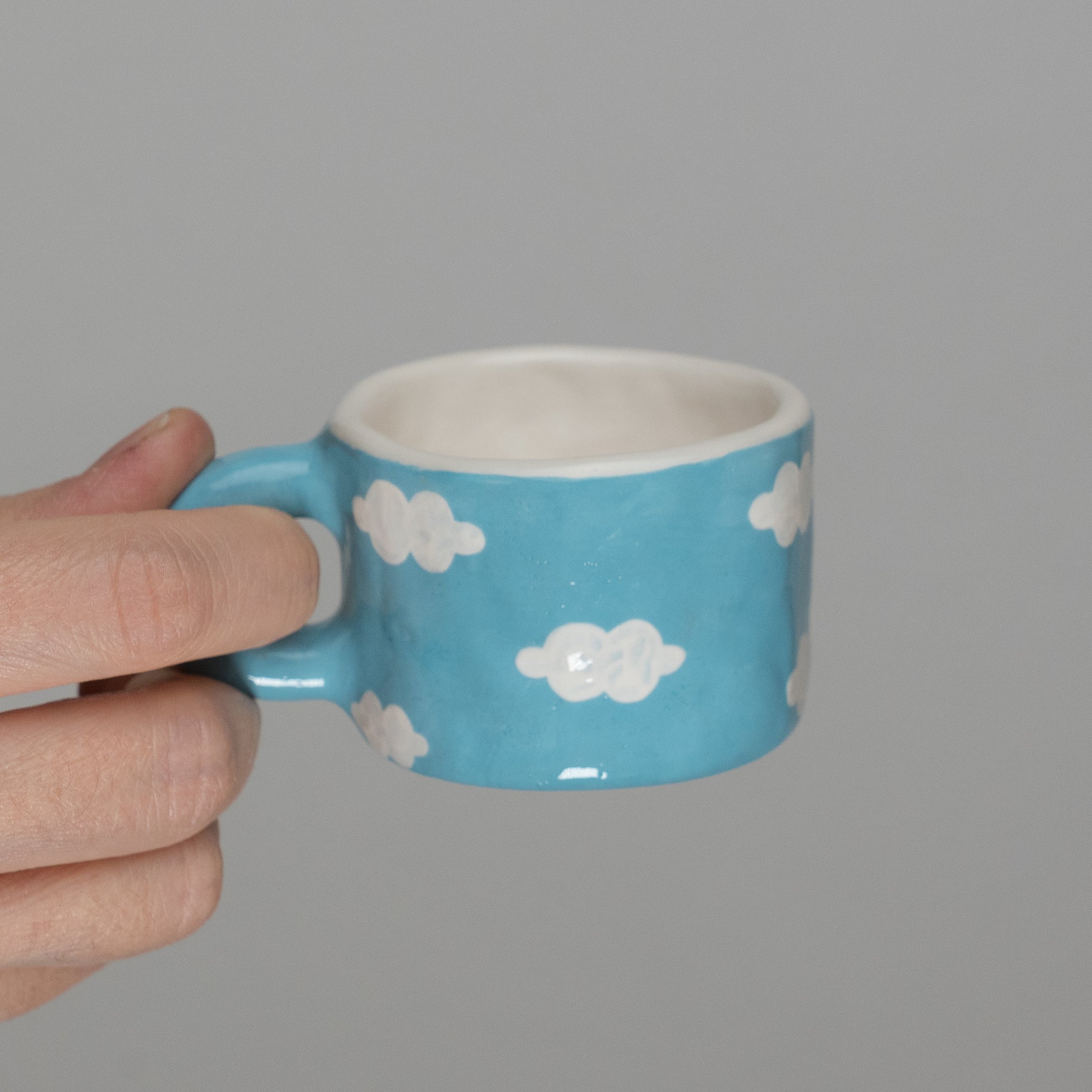 Tazzina con pattern di nuvolette, modellata a mano con la tecnica del pizzicato. Dimensioni indicative: altezza 4 cm, diametro 6 cm.