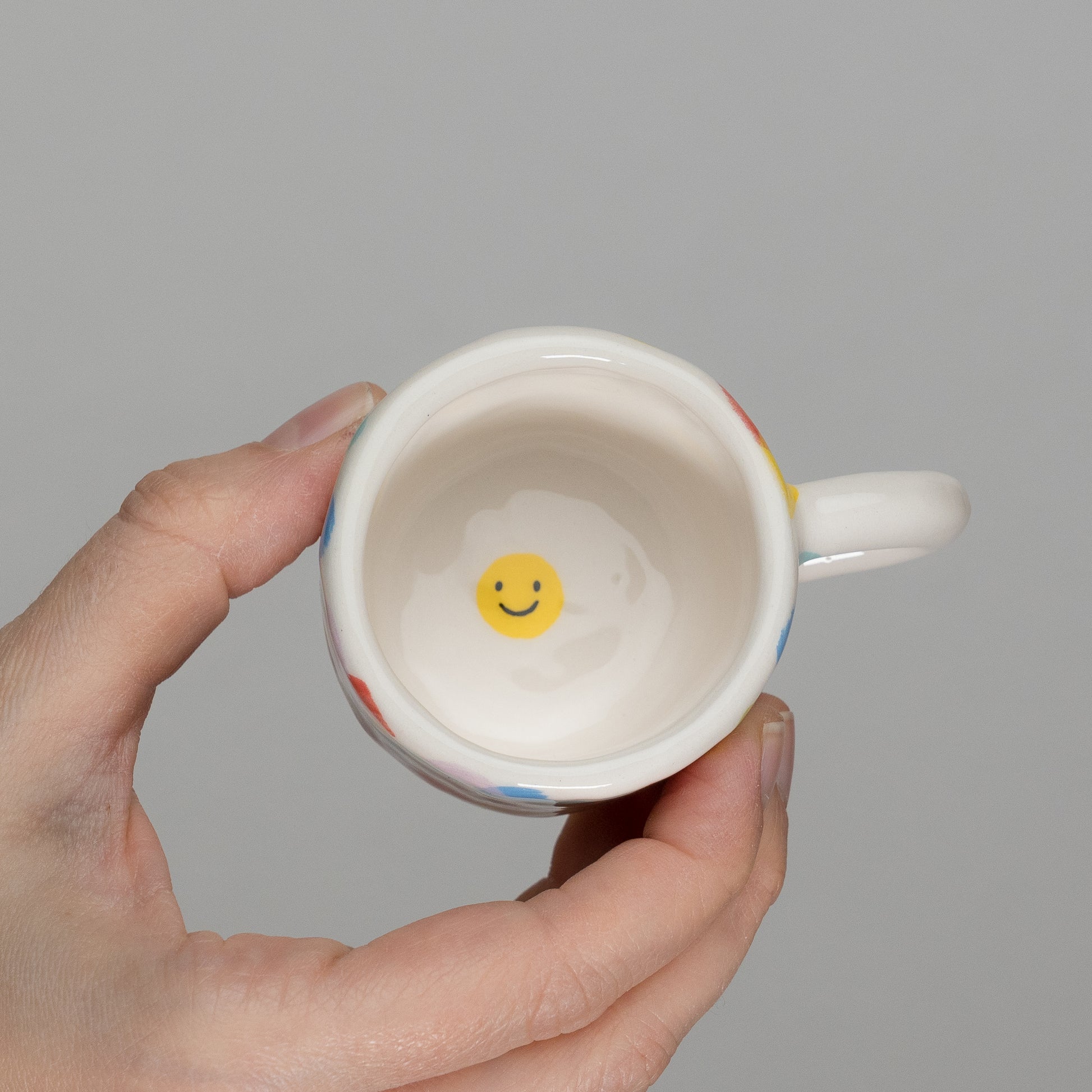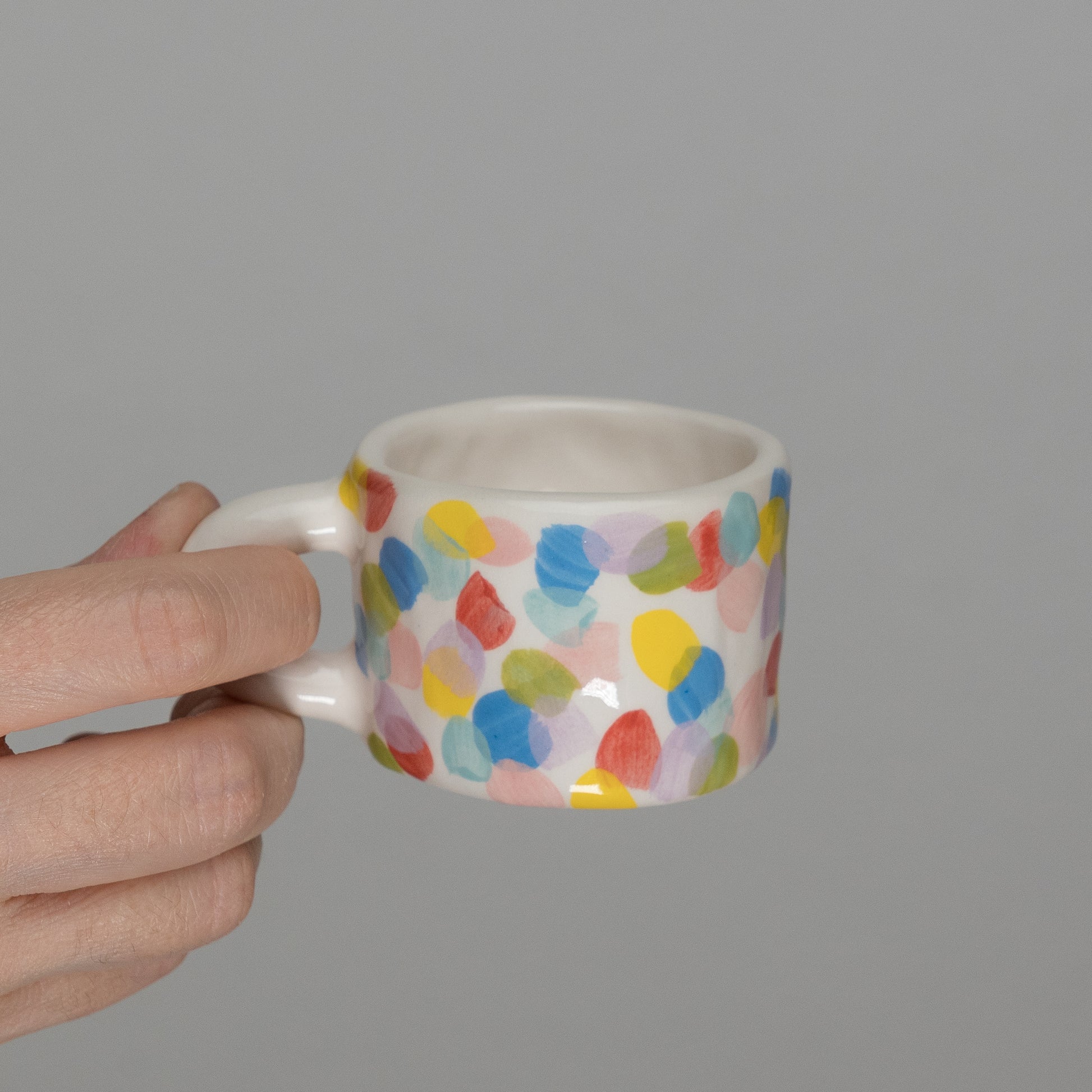 Tazzina con pattern di pois colorati, modellata a mano con la tecnica del pizzicato. Misure indicative: altezza 4 cm, diametro 6 cm.